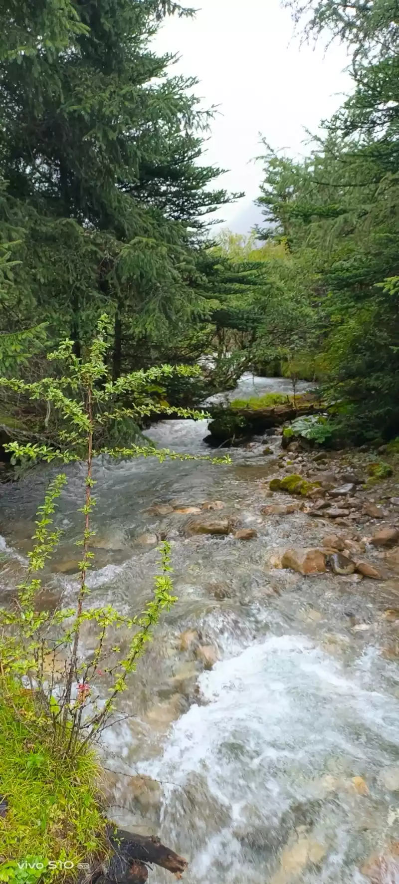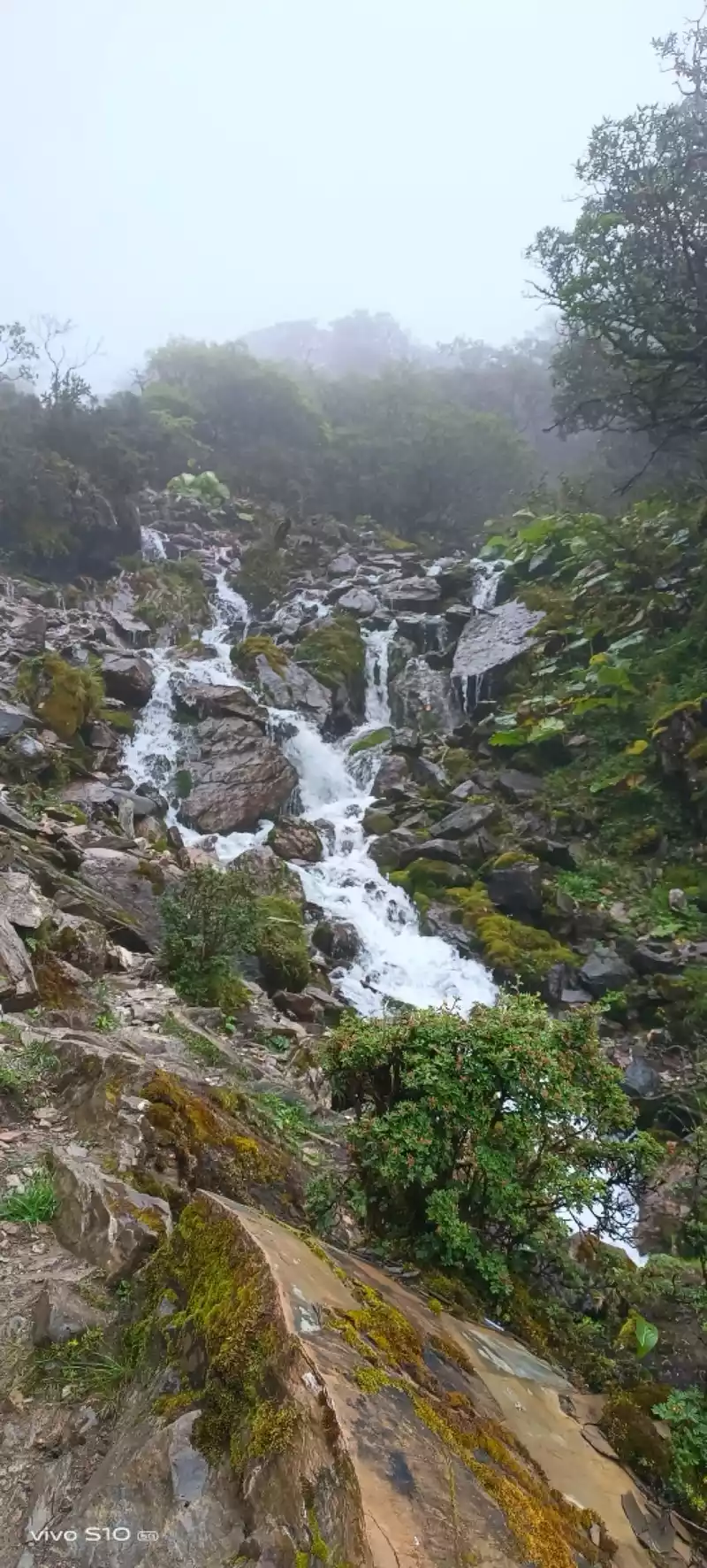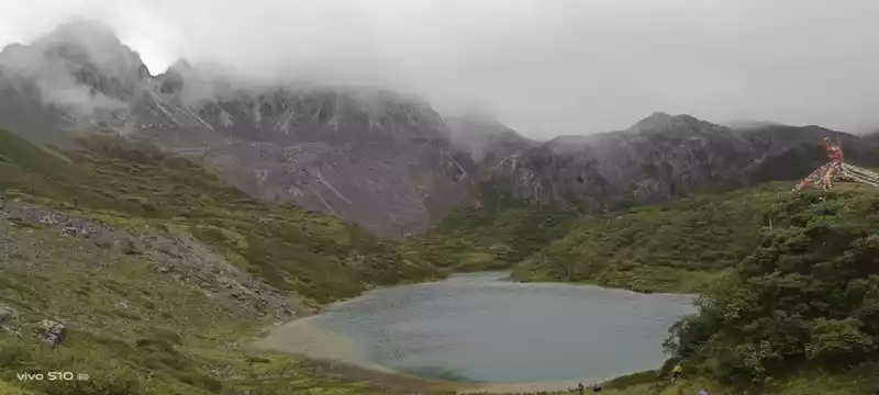 The river we encountered during the hike. There are so many rocks here, and the river flows over them, making a magnificent sound. The splashes of water from the rocks also reveal that the water here is exceptionally clear. Some rocks are covered in moss, and feel very smooth to the touch. Stones like these have likely been washed by water for tens of thousands of years. Walking along one path, I came across a lake. The lake was an emerald green, perfectly blending in with the surroundings. The mountains in the distance were cleverly hidden by the sea of clouds, their peaks appearing white. Even higher peaks were practically invisible.