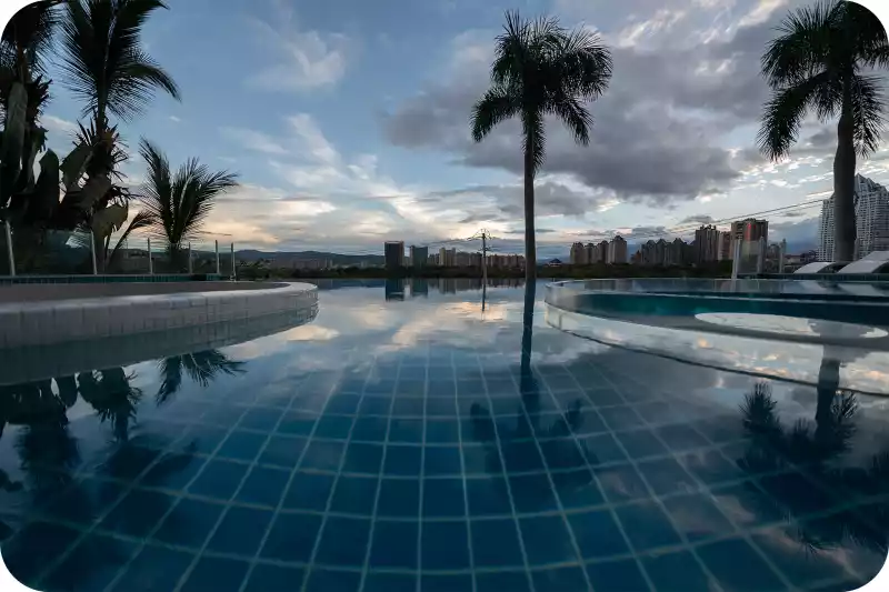 In the evening, you can see the beautiful sunset in front of the swimming pool.