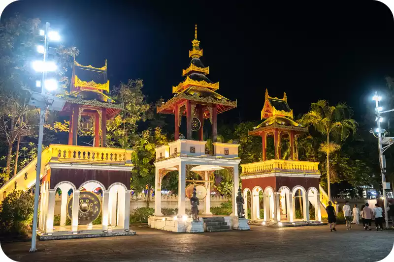 After dinner, we checked in at the Shwedagon Pagoda in Gaozhuang Scenic Area. Below the Shwedagon Pagoda is the popular Starlight Night Market. As one of the landmark buildings in Gaozhuang Scenic Area, the Shwedagon Pagoda can be seen in various places. There are also three miniature bell towers next to the Shwedagon Pagoda.
