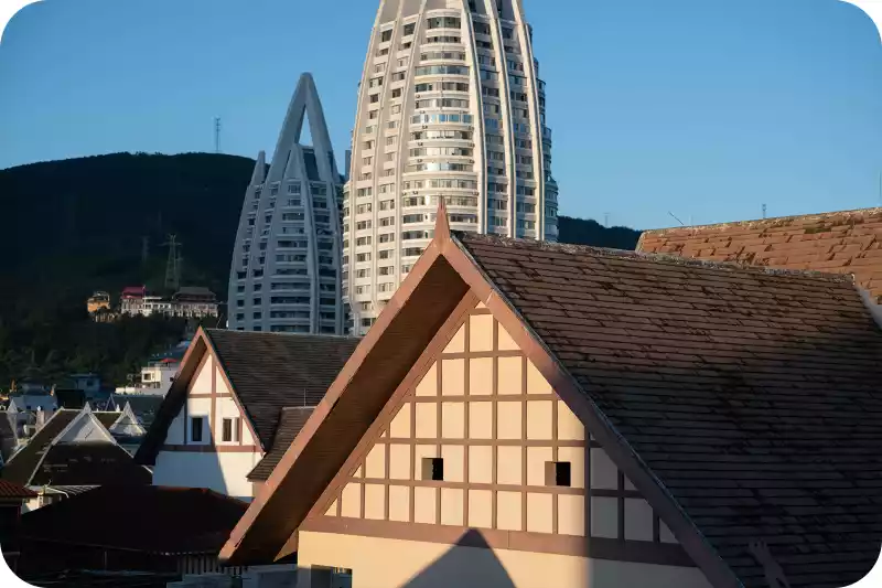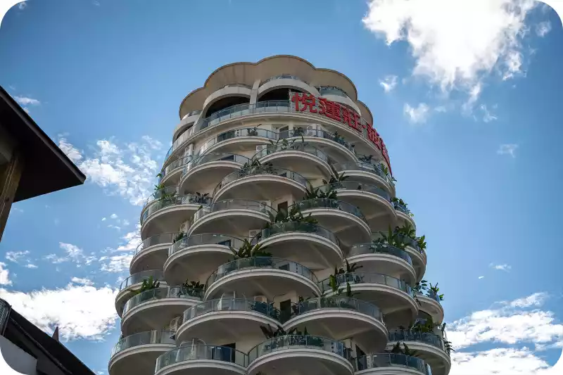 Looking from the side, the hotel's shape is very majestic and has national characteristics.