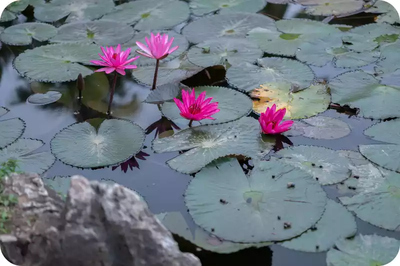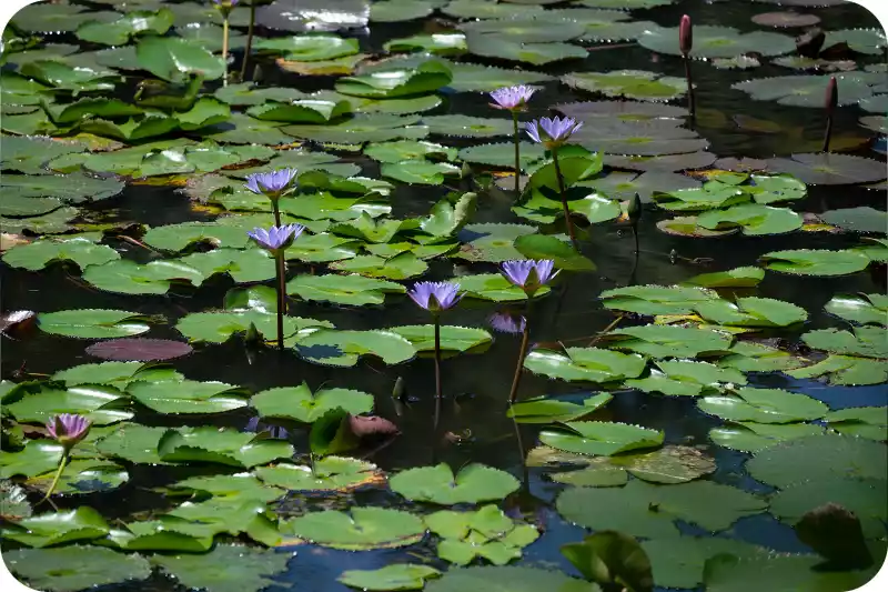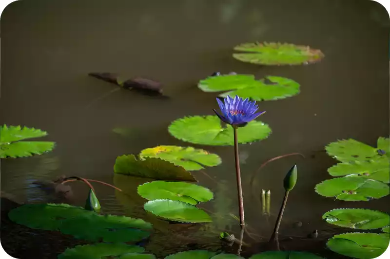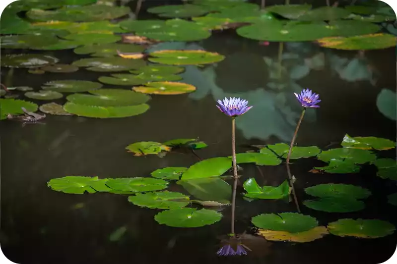 The water lilies in the lake look even more exquisite and lovely against the setting sun.