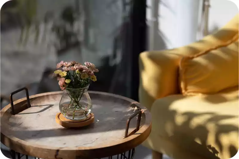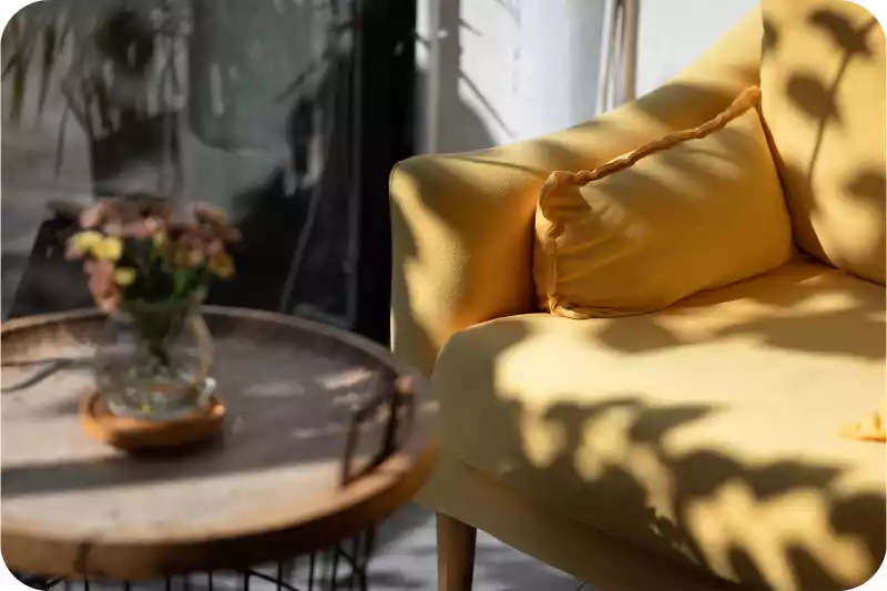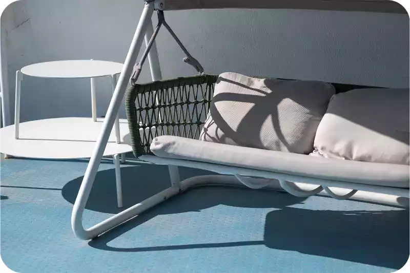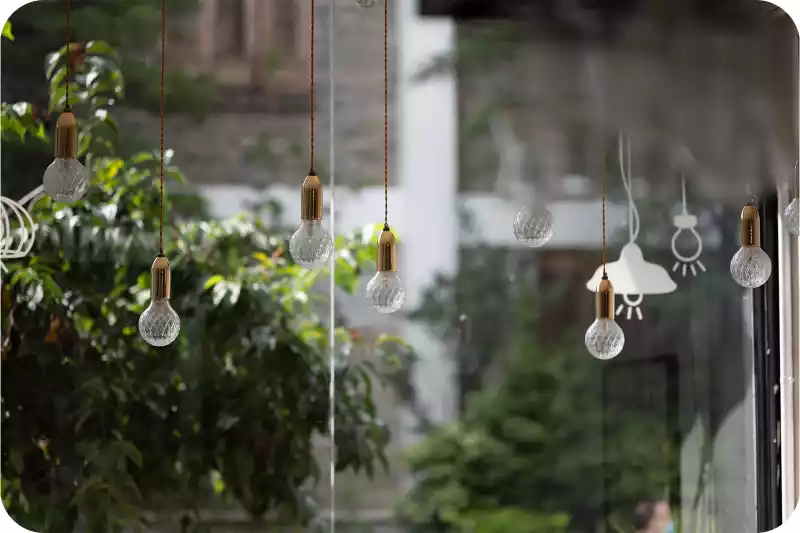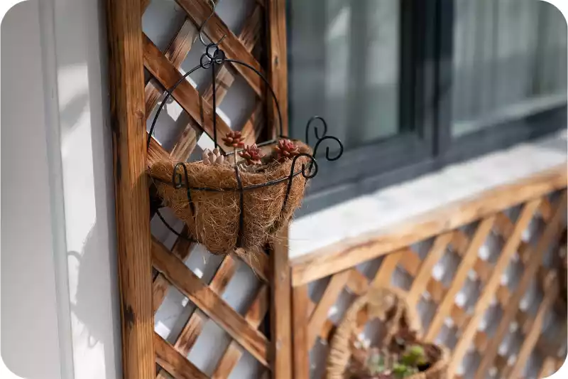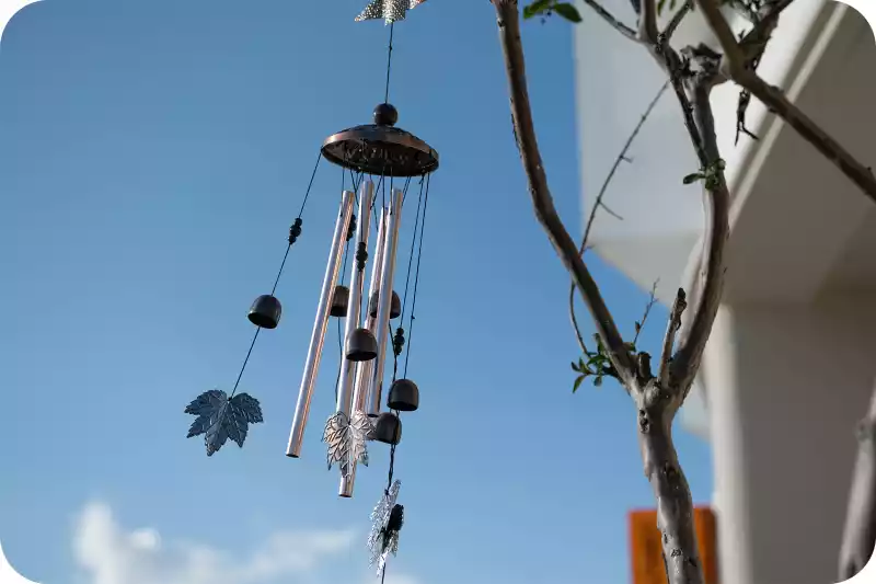 Outside the window, the combination of the small chair and the small wind chime is very beautiful.