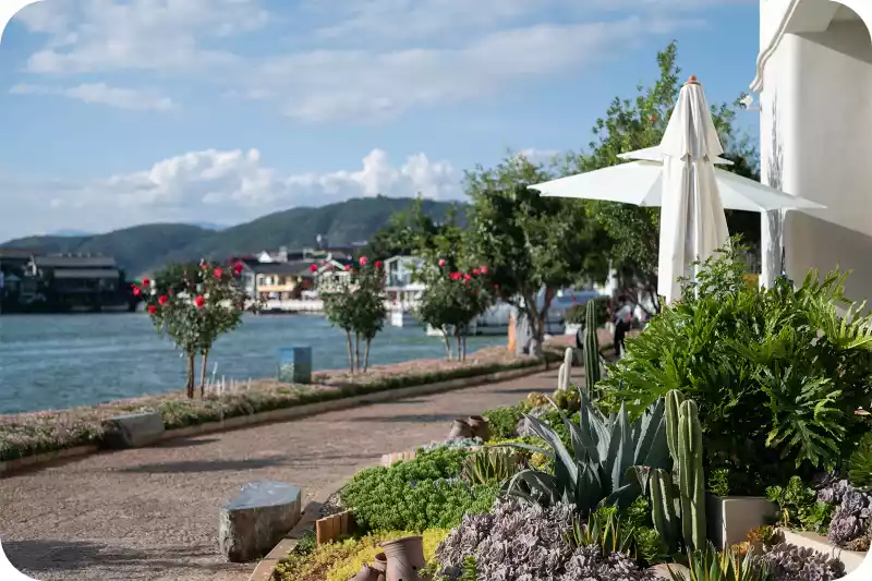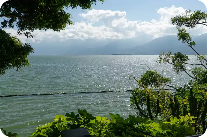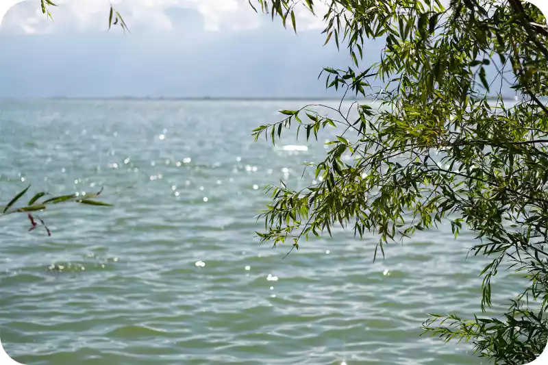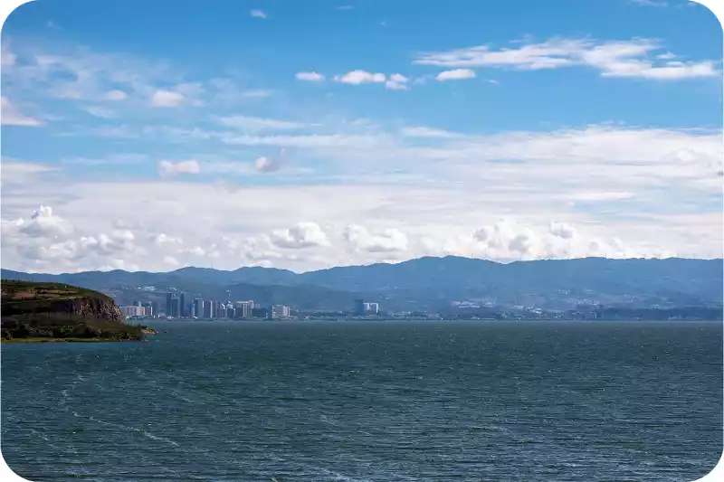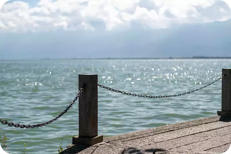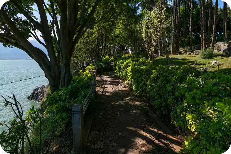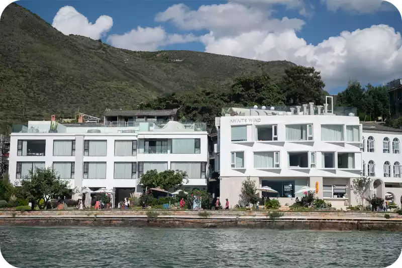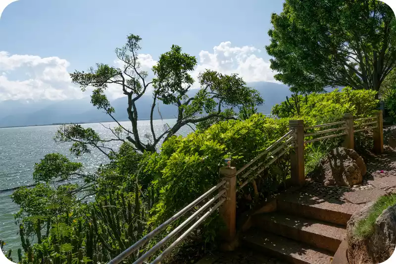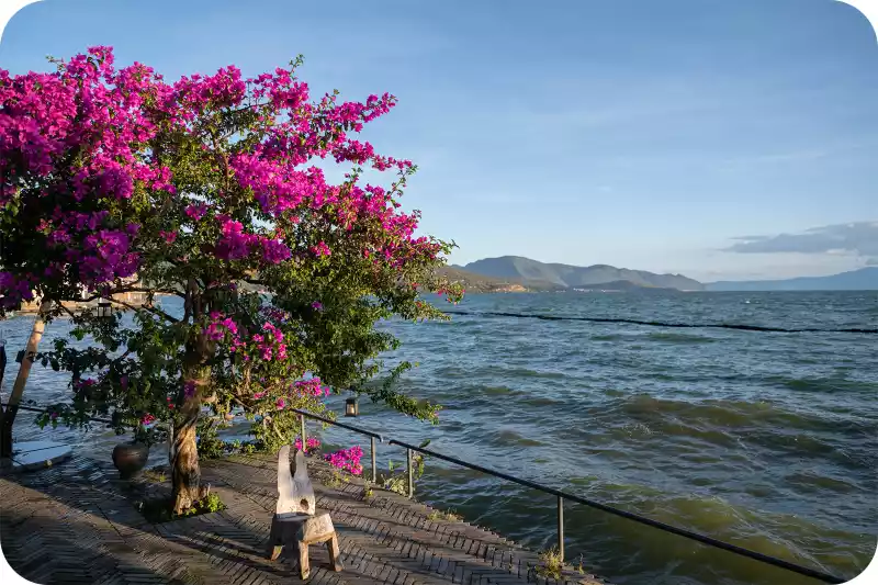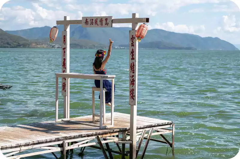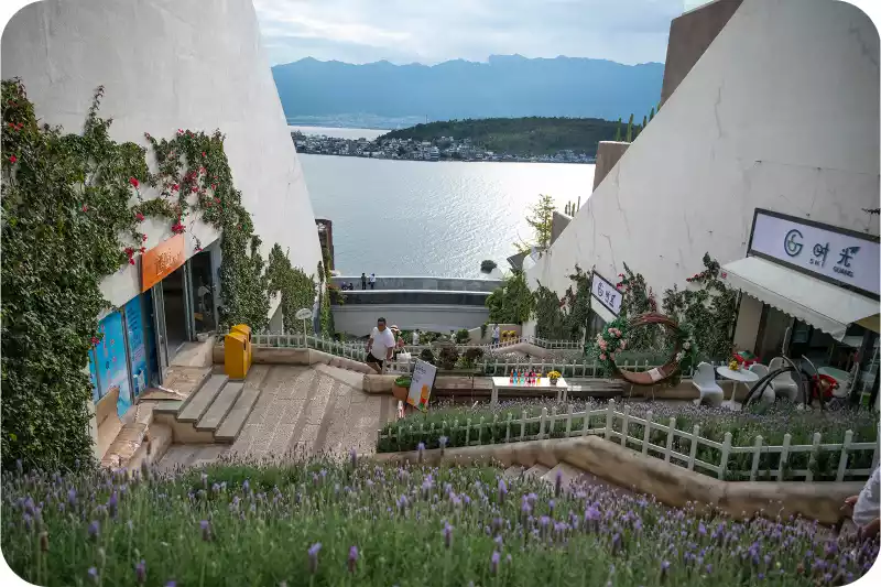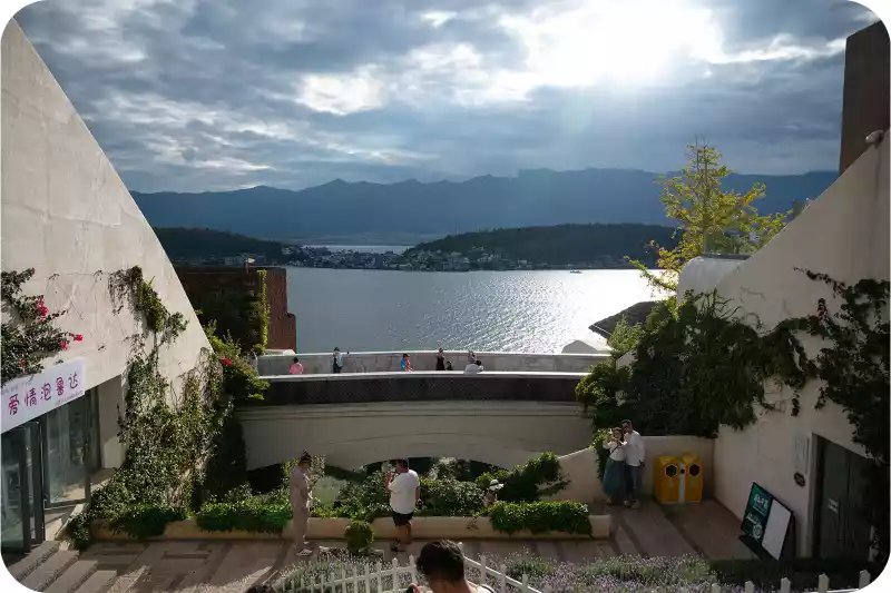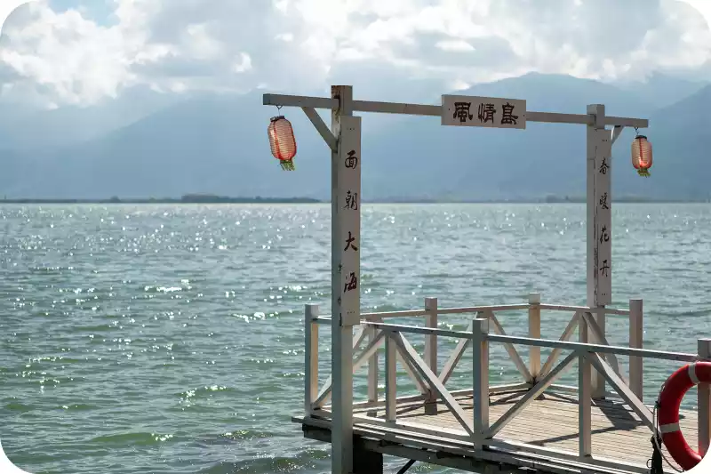 Walking onto the island's coastal boardwalk, you can see the azure Erhai Lake in the distance, with the waves forming beautiful spots of light under the sunlight.