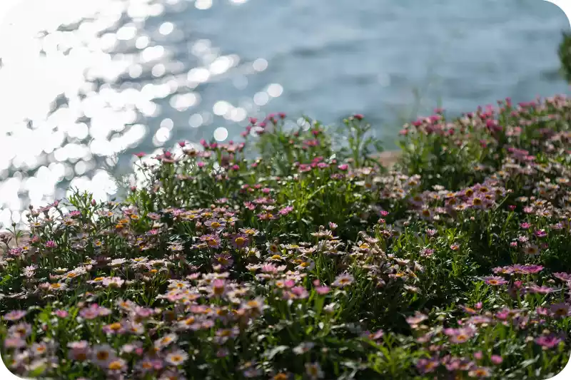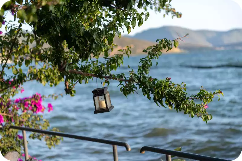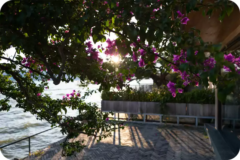 The bougainvillea on the edge of Erhai Lake has been dyed a light golden by the setting sun.