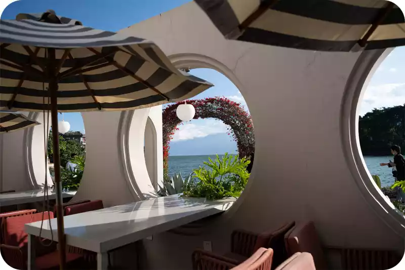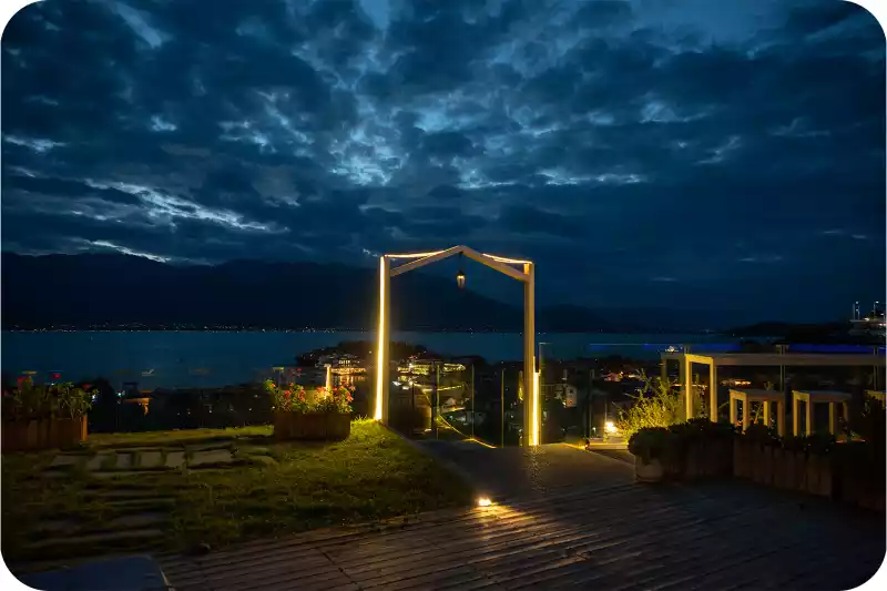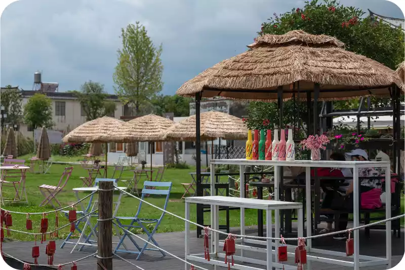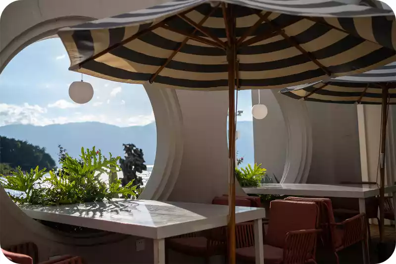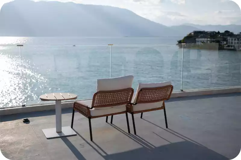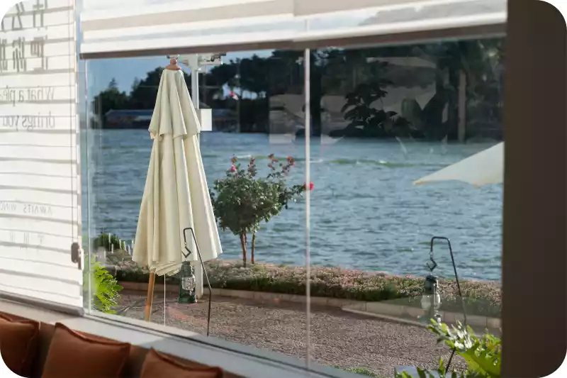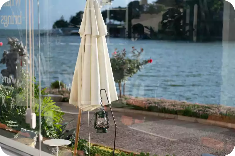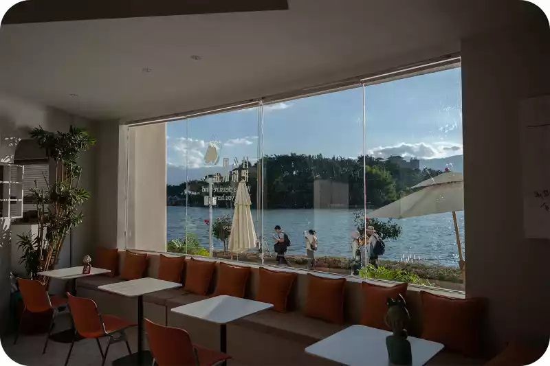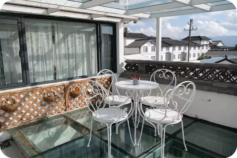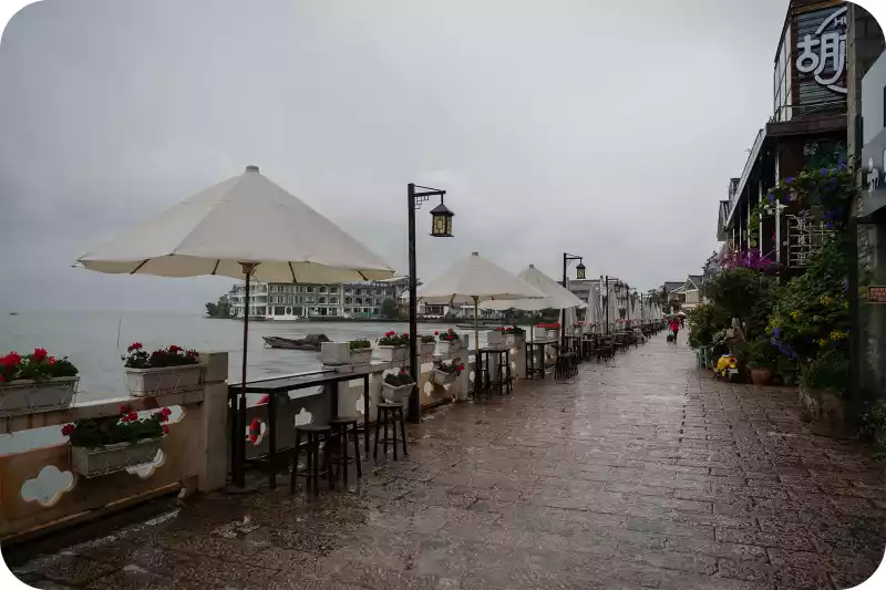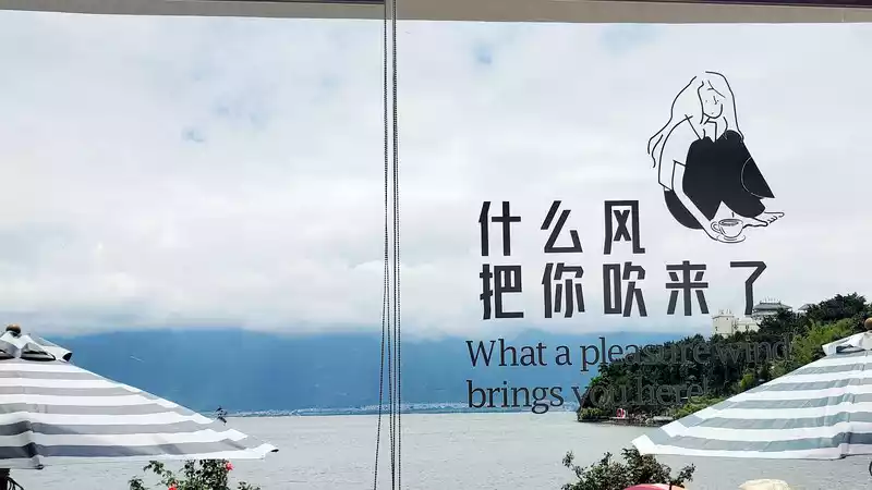 Outside the cafe on the first floor, there is a large parasol, which is a perfect match with the blue sky and white clouds of Erhai Lake next to it.