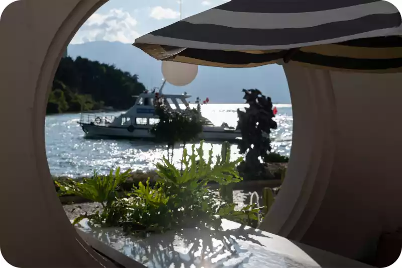 The place with the five-star red flag on the shape of the cruise ship is a cafe called Cave.