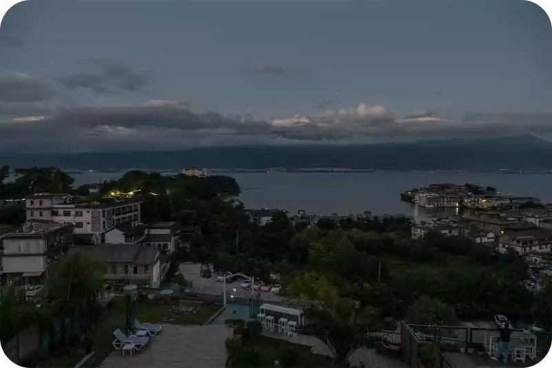 At this moment, the pale yellow lights in Dali Ancient Town appeared even warmer against the dark green backdrop of Cangshan Mountain in the distance.