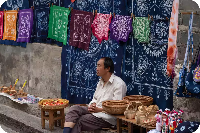 At the roadside stalls, the simple Bai people are waiting for the arrival of tourists.