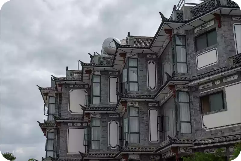 The buildings on the side are very characteristic of the Bai ethnic group.