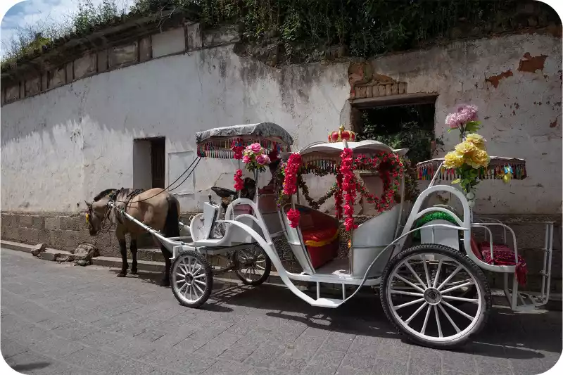 On the roadside, a carriage for visiting the ancient town was parked. The horse lowered its head. It must be very tired.