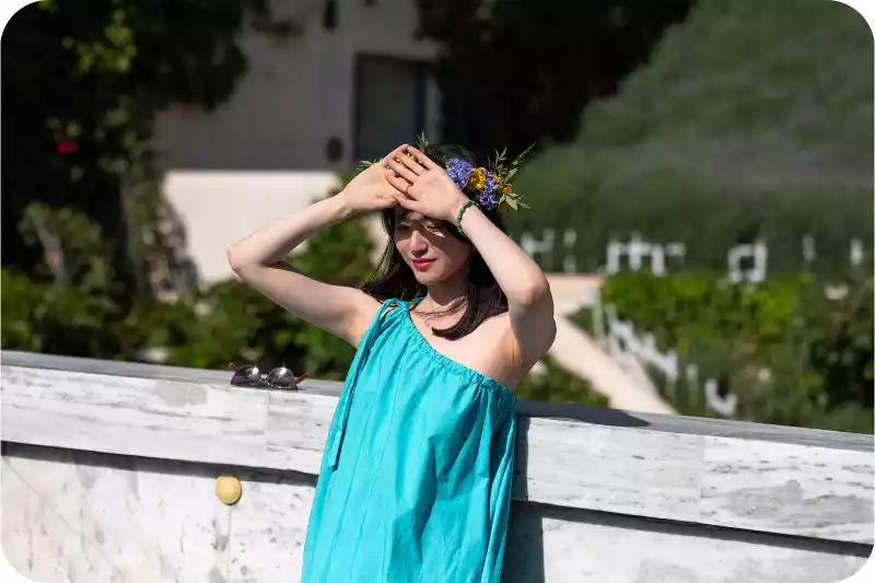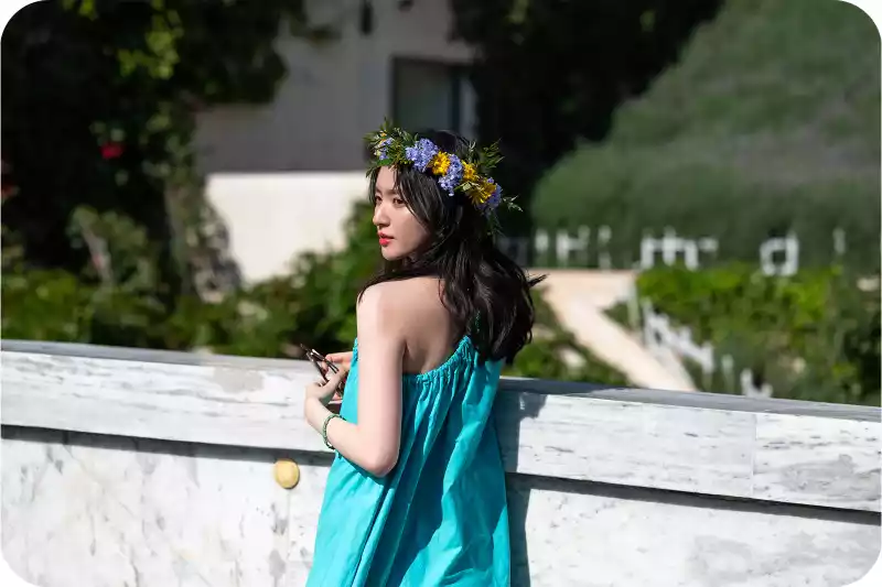 Walking on the streets of Ideal State, the blue dress of this young lady on the side of the road perfectly complements the white buildings in the town.