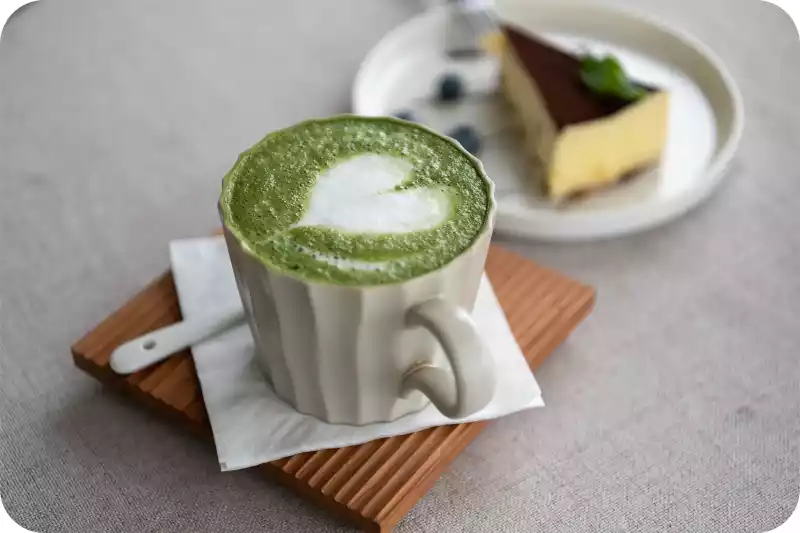 Matcha latte paired with cheese cake makes for a great morning tea time.