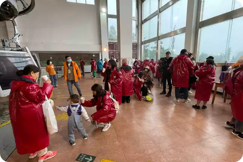 Shortly after exiting the cable car station, ice particles and light rain suddenly fell simultaneously. Seeing the rain getting heavier, all the tourists were forced to retreat back to the cable car station.