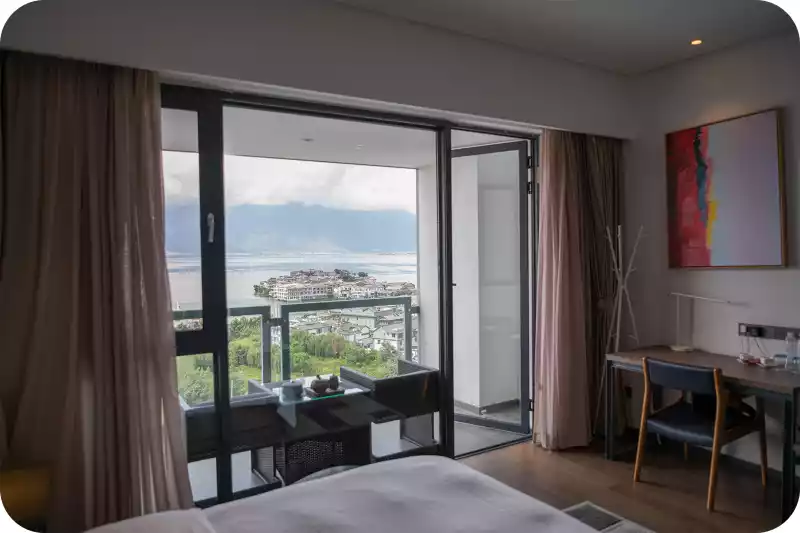 The rooms in the inn have a small balcony, from which you can overlook the Erhai Lake across the way.