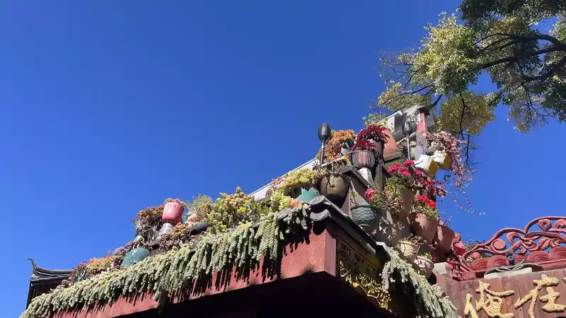I walked up to the rooftop terrace of the inn again. I took the first photo of my Yunnan trip here last year, and I still miss it very much. The railings on both sides of the terrace are hung with succulents in good condition. It was already noon. On the way to lunch, I ran into a cute Shiba Inu who was asking for a hug.