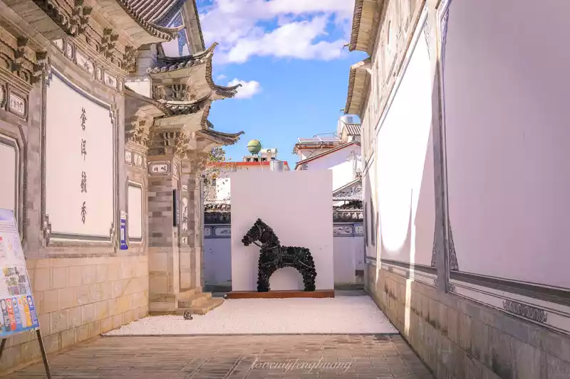 On one side, the old Bai ethnic minority courtyards are preserved, while on the other side, there is a modern cafe.