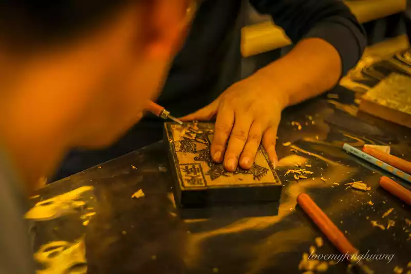 First, the text and pattern are written backwards on a wooden board, followed by fine carving.