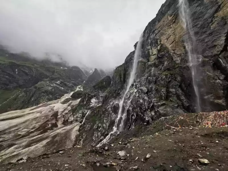 Then, I saw the waterfall again. I think that although the Tiger Leaping Gorge waterfall isn't well-known (it doesn't even have a proper name), it's definitely worth seeing. The waterfall splits into several streams, and from a distance, they look like tree roots. The feeling is even more pronounced from a high vantage point. Even at the peak, the streams constantly mix and separate—it's truly spectacular.