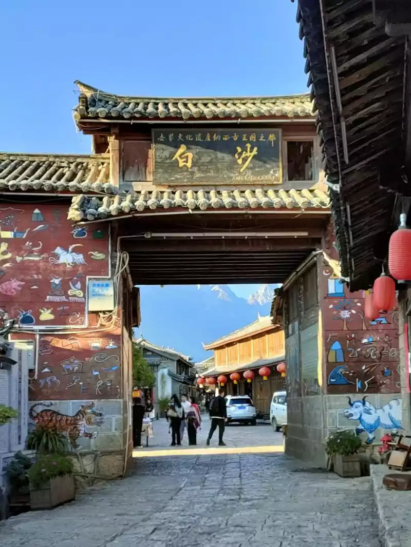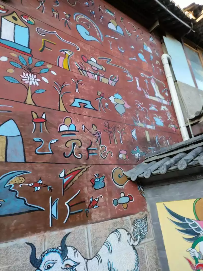 The next day, we moved to Baisha Ancient Town. Baisha Ancient Town is also a town full of art. I love the graffiti walls here; they are so beautiful. The key point is that the graffiti here looks like stick figures. It's not large-scale graffiti. It's these scattered embellishments that make it interesting. (Note that many of them are hieroglyphs)