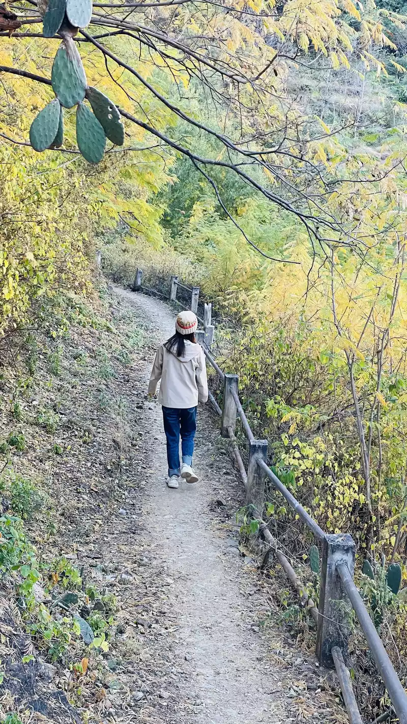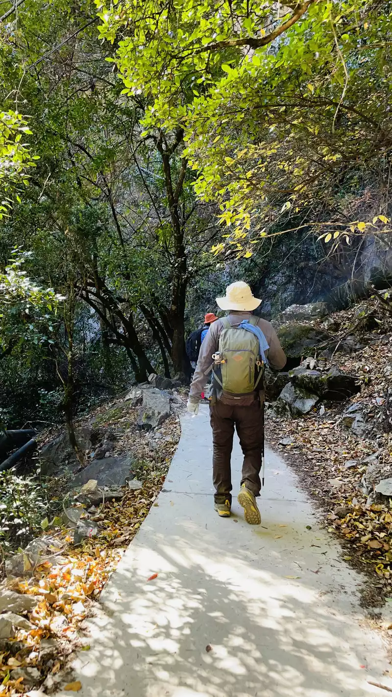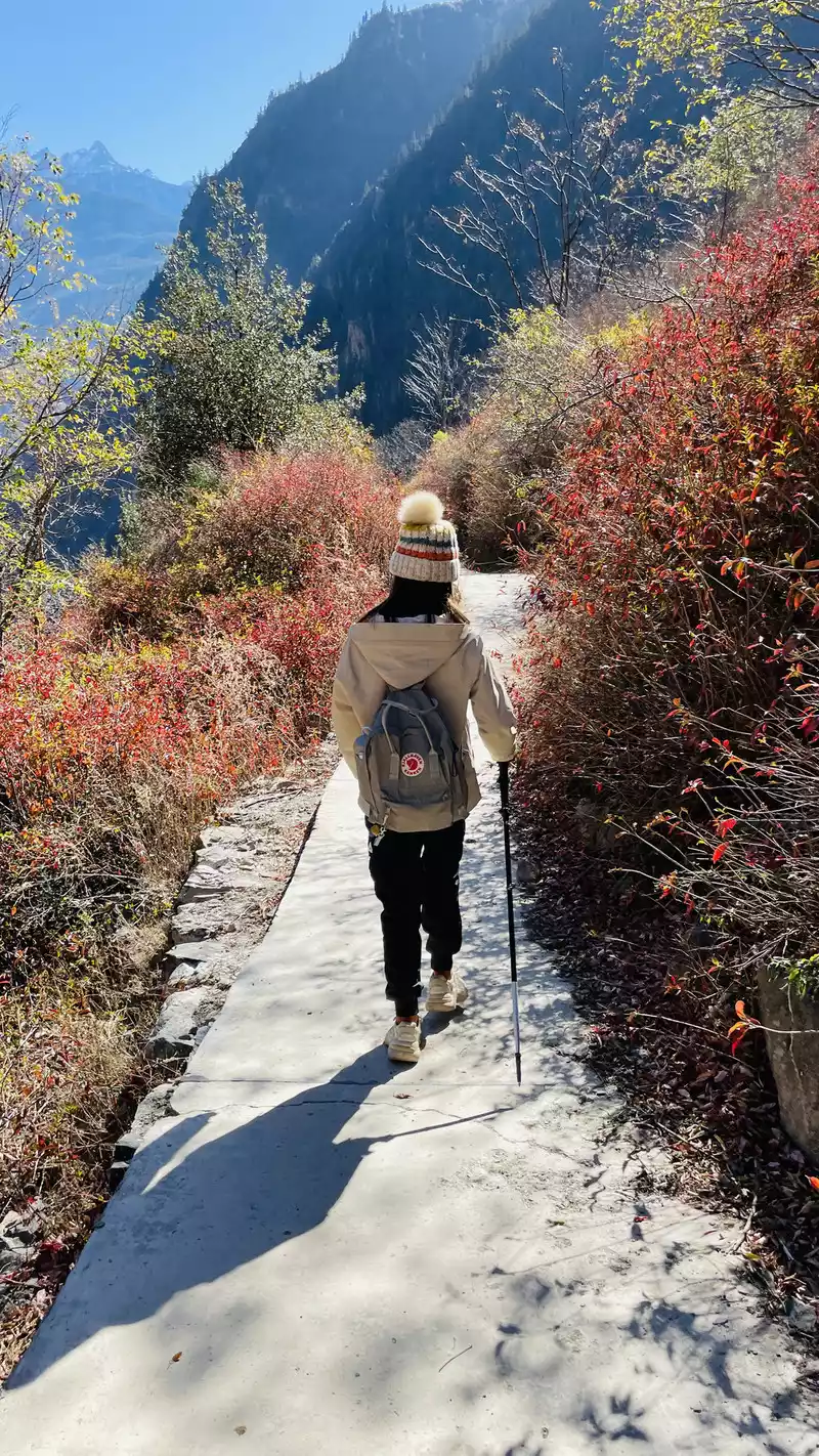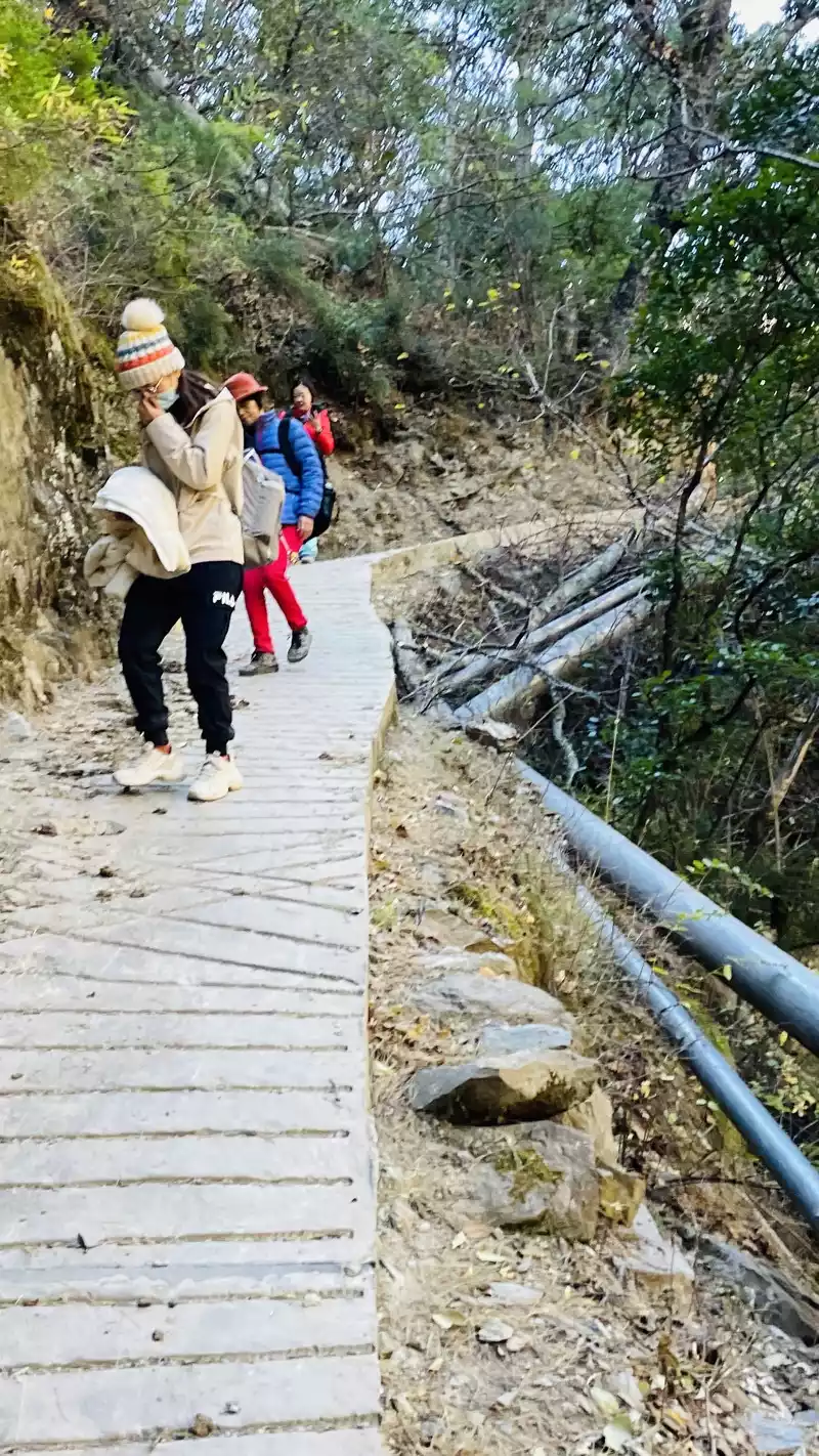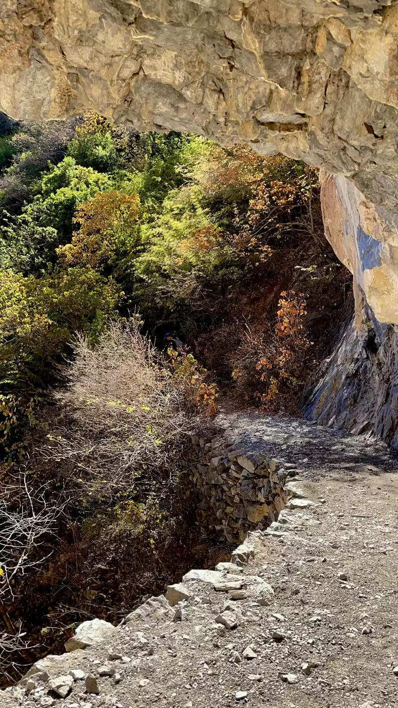 Perhaps everyone was worried about Jiangsu's sister's stamina, so the tour leader told me to lead the way, while he followed behind. Brother Wang gave my sister his trekking pole, and the tour leader taught her how to use it to leverage her strength. Walking ahead, I took this photo. Watching my sister, learning to use her trekking poles, finally become completely untraceable, just like me back then, I couldn't help but burst into goose-like laughter (sorry for the loud laughter, hahaha). The Nylon Canyon trail is also entirely concrete. After walking about a third of the way, the remaining two-thirds is a narrow path, about one meter wide. There are many long, steep and gentle downhill slopes. My shoes were too slippery, so I had to tread slowly along the cliff face. After my anxious sister fell once, the tour leader repeatedly urged us to walk slowly and steadily. Perhaps not wanting us to wait, my sister told us it was okay to go ahead and they would catch up slowly. The canyon scenery is beautiful: the gurgling stream, the crimson and yellow autumn colors, and the pine cones scattered everywhere. So, despite the distance, it didn't feel long. After more than two hours of trekking, we arrived at the only rest stop along the way: the Secret Realm Inn. There were free rest booths and hot water along the roadside, and groups of pedestrians stopped here to rest. The sisters arrived shortly after. The sister complained about blisters on her feet. The tour leader checked and found her hiking shoes were too loose, so he retightened them for her. I mean, where can you find such a thoughtful and considerate tour leader? Haha! After unloading our packs, we shared snacks. Wang's Snickers came in handy again. After a brief rest, we got back on the trail. The tour leader encouraged us, saying we were doing great and had already covered most of the way quickly, so we should be able to finish in just over an hour. The trail ahead was flat, but it continued with cliff after cliff until the end. The canyon roared and echoed, its depth unseen. Some sections of the path were completely unprotected, and even though I'd overcome my fear of heights, I still felt intimidated. I simply clung to the guide's bag straps and scrambled along the wall, not daring to look. This was a road often used by villagers on motorcycles. I admired their courage, but I was also concerned about their safety.