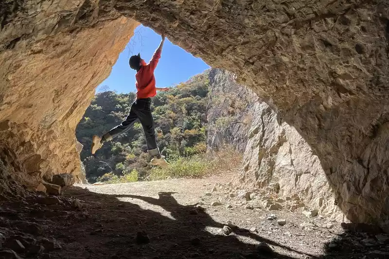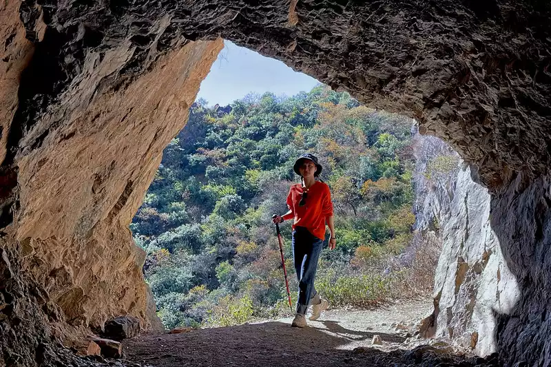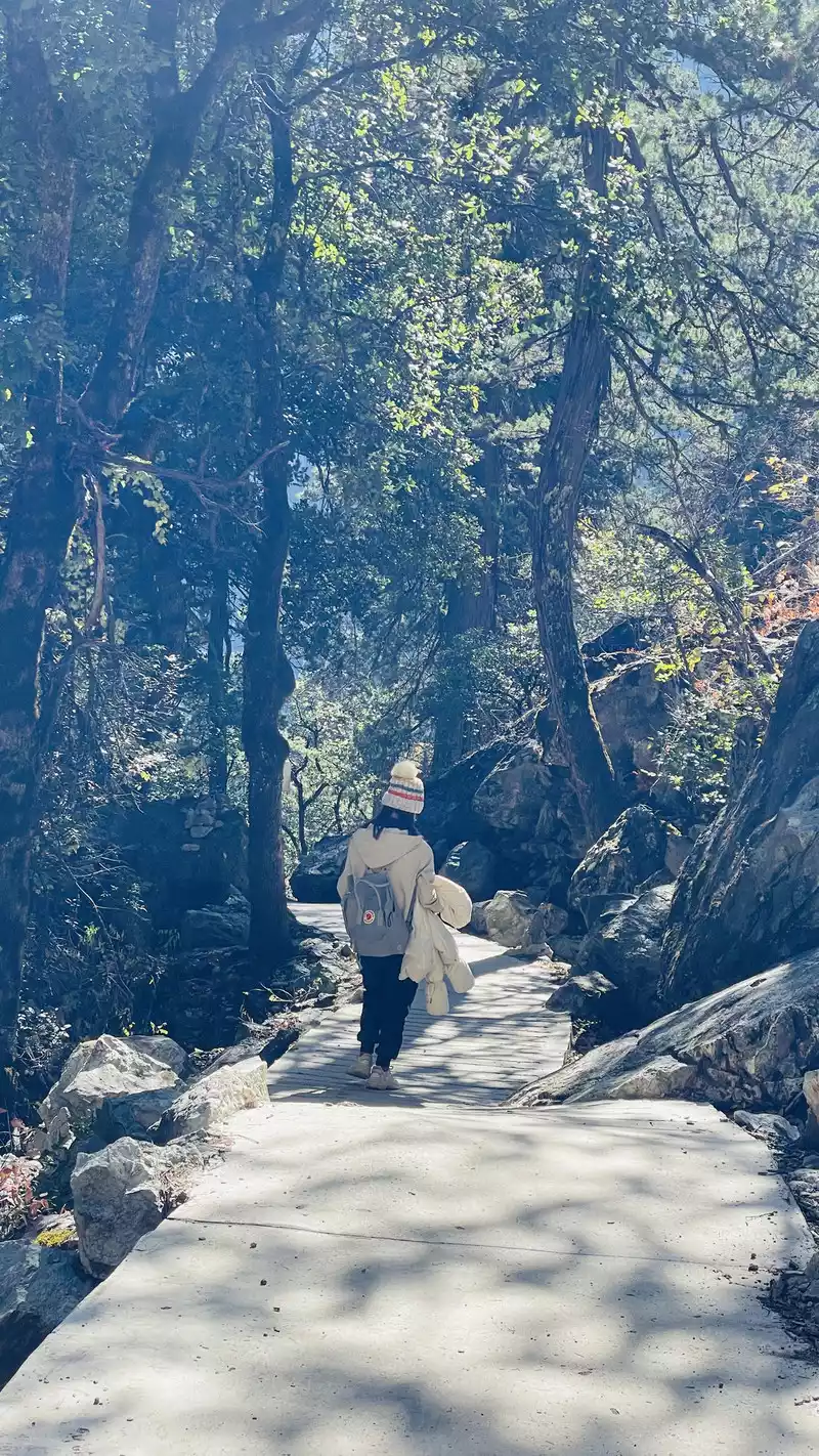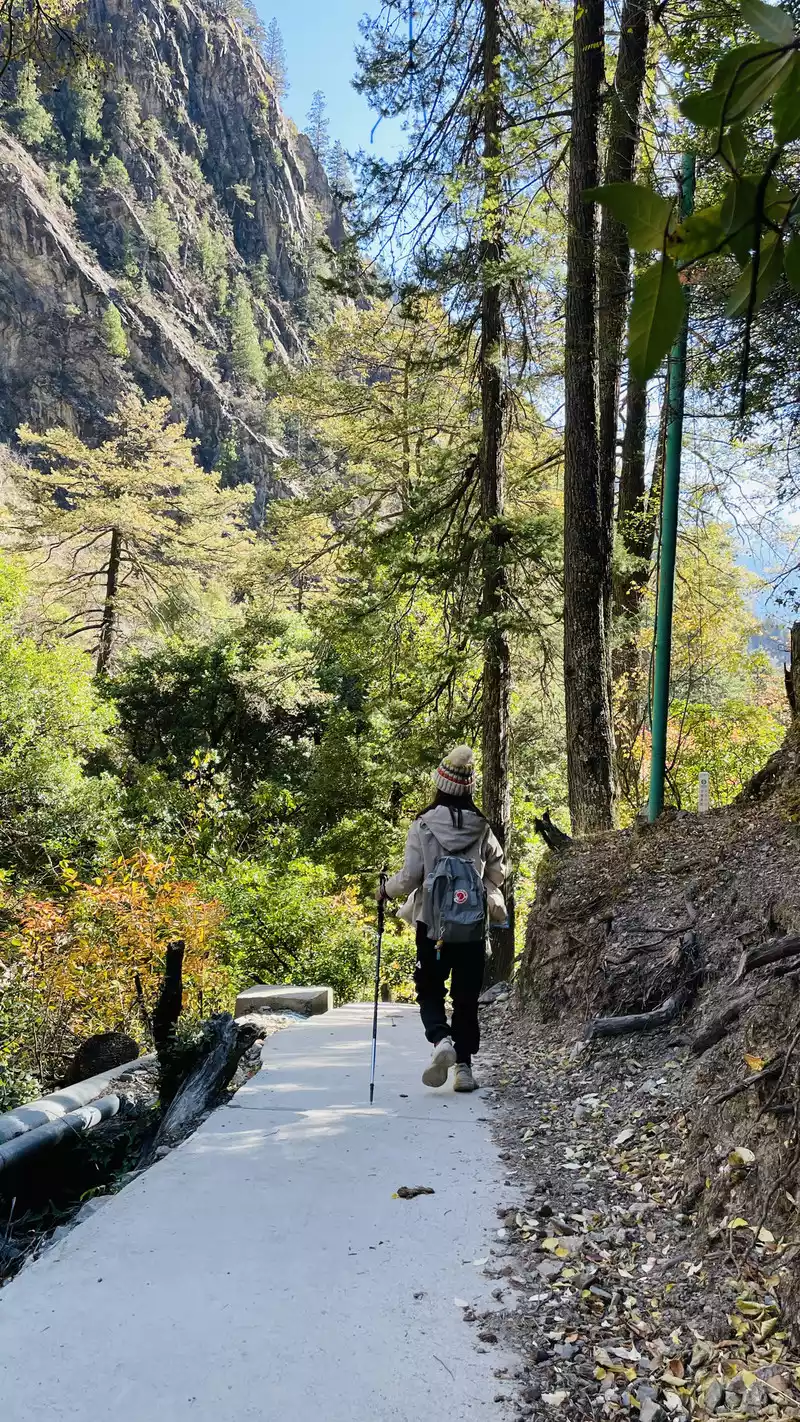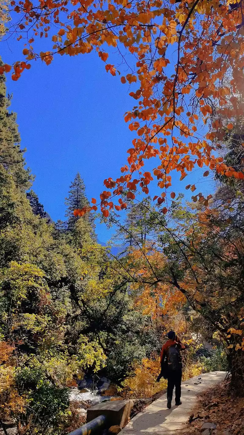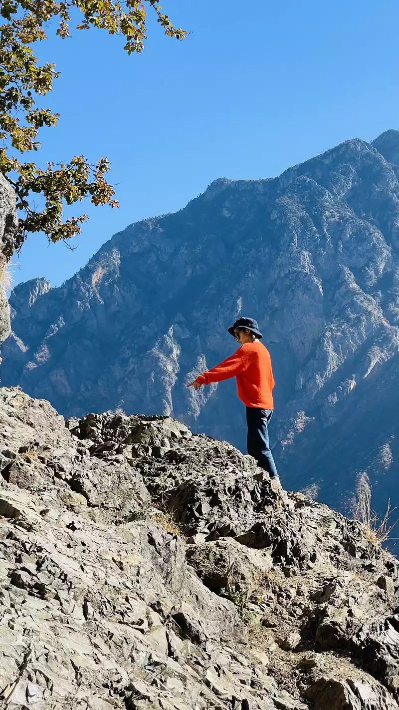 Perhaps everyone was worried about Jiangsu's sister's stamina, so the tour leader told me to lead the way, while he followed behind. Brother Wang gave my sister his trekking pole, and the tour leader taught her how to use it to leverage her strength. Walking ahead, I took this photo. Watching my sister, learning to use her trekking poles, finally become completely untraceable, just like me back then, I couldn't help but burst into goose-like laughter (sorry for the loud laughter, hahaha). The Nylon Canyon trail is also entirely concrete. After walking about a third of the way, the remaining two-thirds is a narrow path, about one meter wide. There are many long, steep and gentle downhill slopes. My shoes were too slippery, so I had to tread slowly along the cliff face. After my anxious sister fell once, the tour leader repeatedly urged us to walk slowly and steadily. Perhaps not wanting us to wait, my sister told us it was okay to go ahead and they would catch up slowly. The canyon scenery is beautiful: the gurgling stream, the crimson and yellow autumn colors, and the pine cones scattered everywhere. So, despite the distance, it didn't feel long. After more than two hours of trekking, we arrived at the only rest stop along the way: the Secret Realm Inn. There were free rest booths and hot water along the roadside, and groups of pedestrians stopped here to rest. The sisters arrived shortly after. The sister complained about blisters on her feet. The tour leader checked and found her hiking shoes were too loose, so he retightened them for her. I mean, where can you find such a thoughtful and considerate tour leader? Haha! After unloading our packs, we shared snacks. Wang's Snickers came in handy again. After a brief rest, we got back on the trail. The tour leader encouraged us, saying we were doing great and had already covered most of the way quickly, so we should be able to finish in just over an hour. The trail ahead was flat, but it continued with cliff after cliff until the end. The canyon roared and echoed, its depth unseen. Some sections of the path were completely unprotected, and even though I'd overcome my fear of heights, I still felt intimidated. I simply clung to the guide's bag straps and scrambled along the wall, not daring to look. This was a road often used by villagers on motorcycles. I admired their courage, but I was also concerned about their safety.