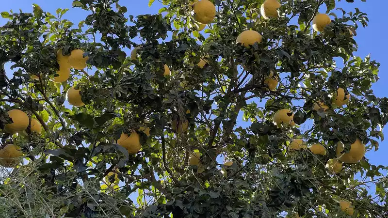 Walking in the fields, looking east and west like a "treasure hunt", I saw yellow fruit trees, orange trees, grapefruit trees, pomegranate trees, and other unknown fruit trees.