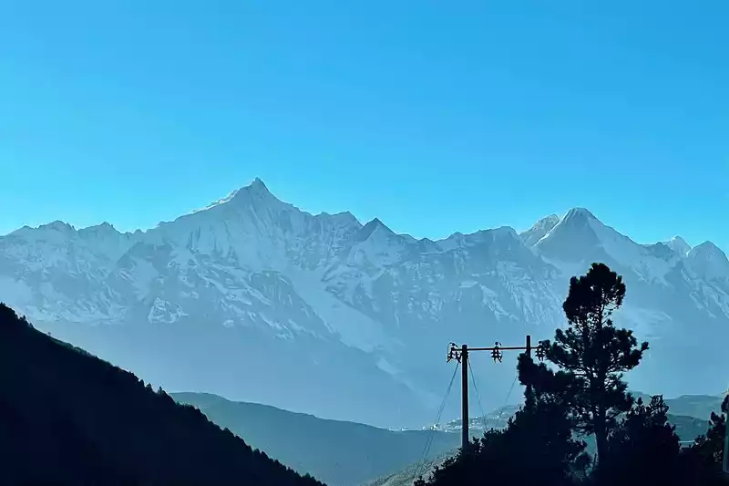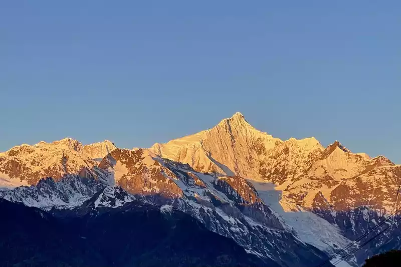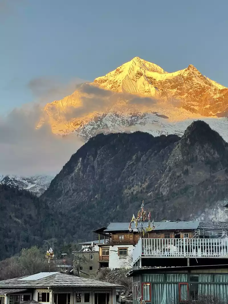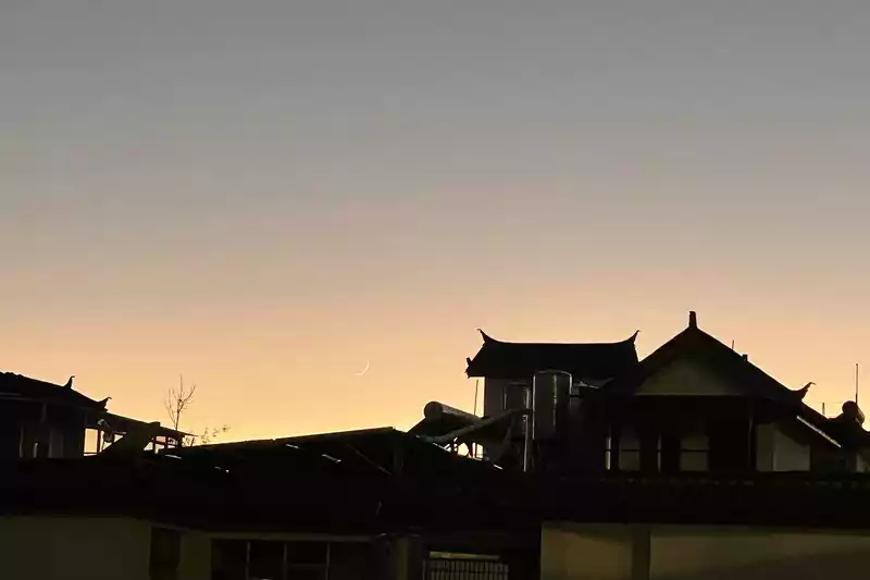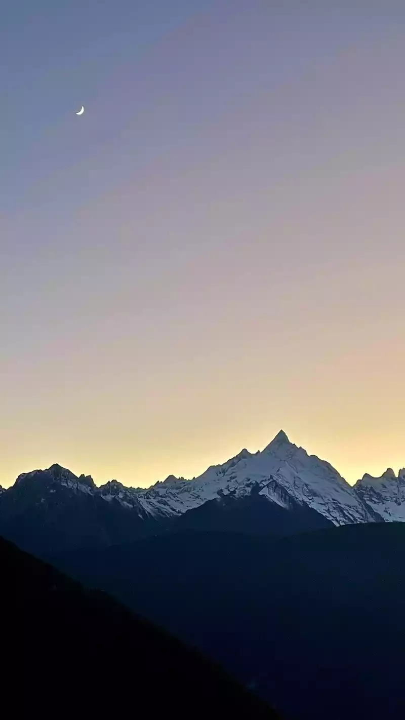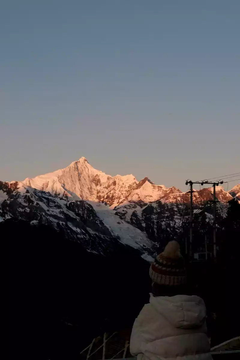We arrived at our accommodation before dark and checked into the Pearl Laka View Hotel, which offers a stunning view of Feilai Temple. The downside to the view is that it's located on a high floor. A minor complaint about the hotel owner's arrogance is that, since most accommodations here don't have elevators and are located at a considerable altitude, our request for help with our luggage was ruthlessly refused. Finally, our tour leader helped us carry our suitcases to our rooms. Before I could even pack, I headed straight for the hotel rooftop, hoping to catch the view in time. Despite my cold hands and feet, I snapped my favorite photo of the Meili Snow Mountain in the afterglow. As the sun set, the peaks were even more vividly outlined, and the crescent moon, imprinted on the upper left corner of Goddess Peak, was both chilling and breathtaking. The tour leader happened to be on the balcony, resulting in the following video.