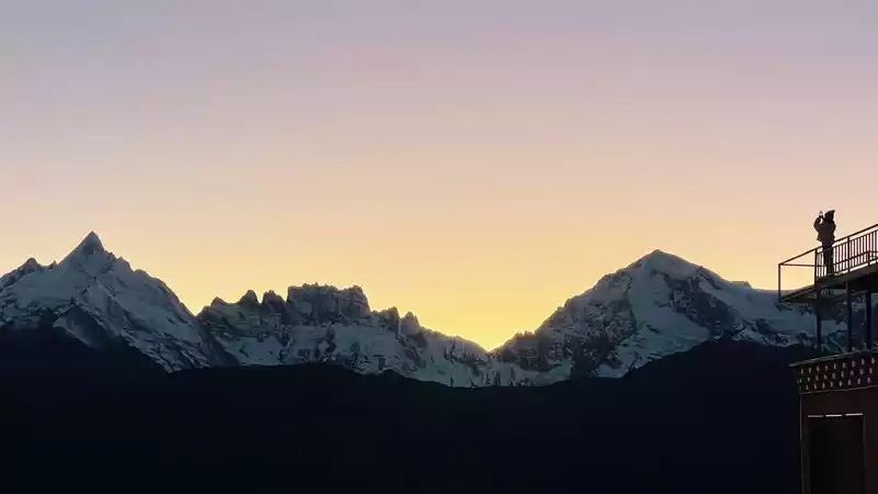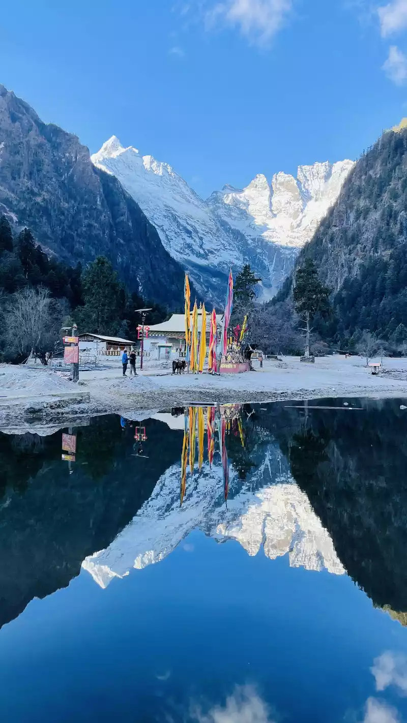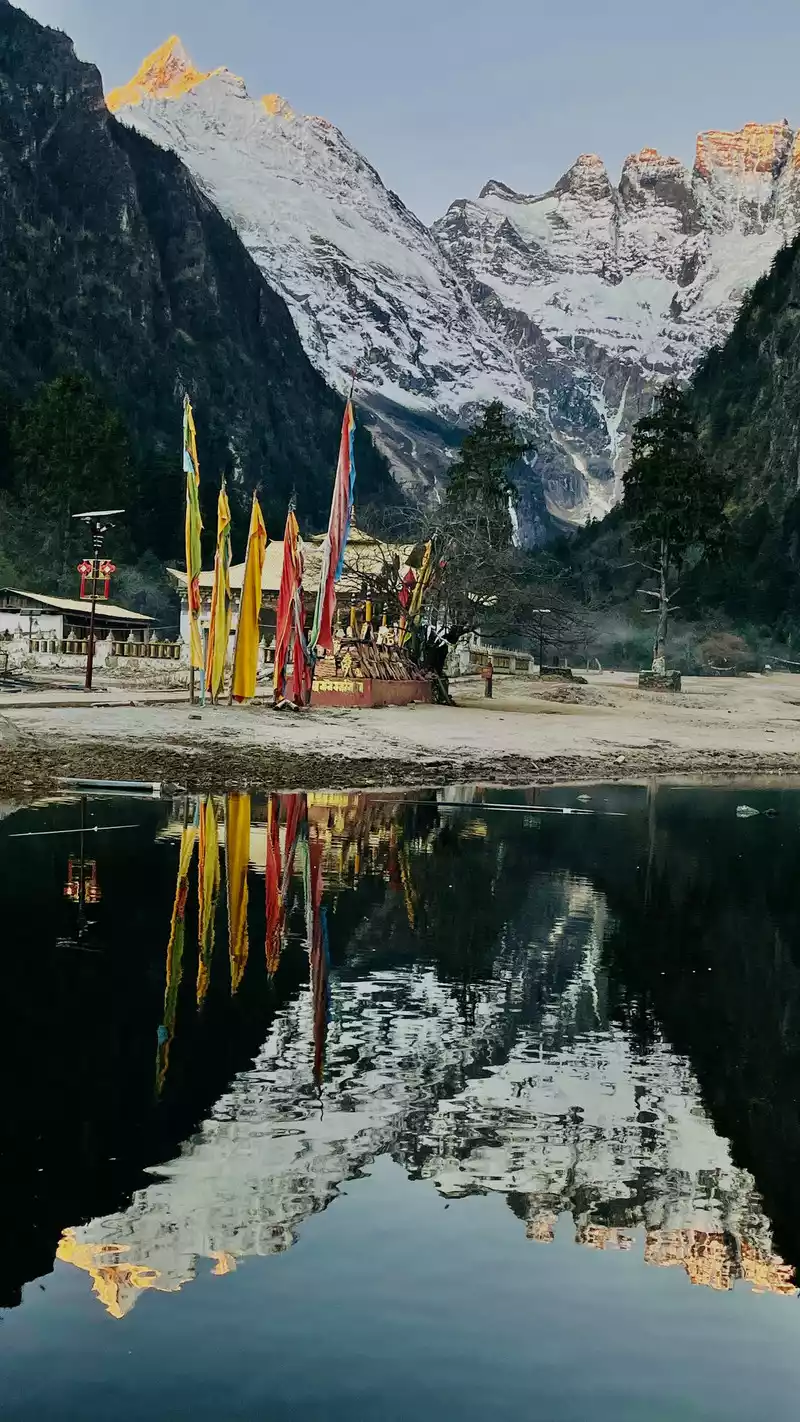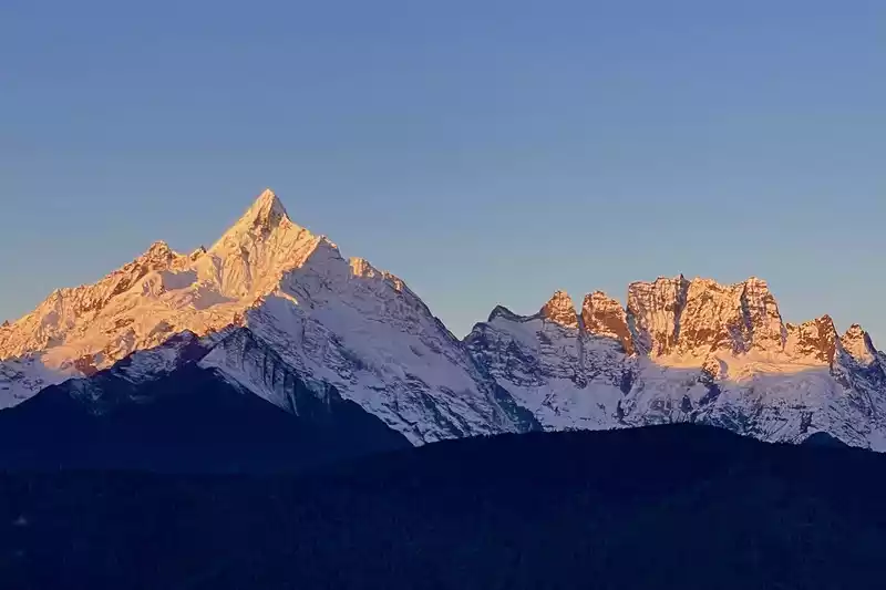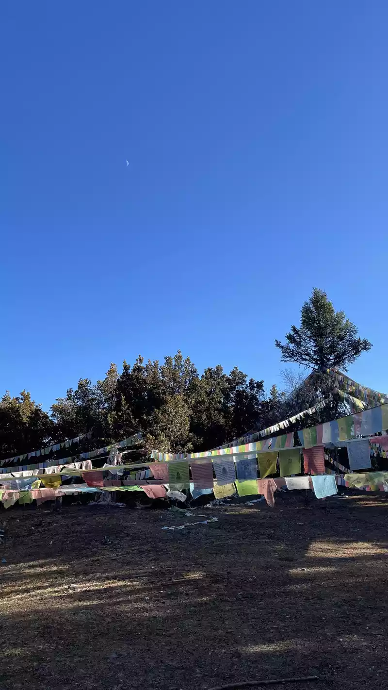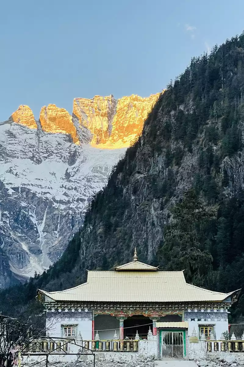 We arrived at our accommodation before dark and checked into the Pearl Laka View Hotel, which offers a stunning view of Feilai Temple. The downside to the view is that it's located on a high floor. A minor complaint about the hotel owner's arrogance is that, since most accommodations here don't have elevators and are located at a considerable altitude, our request for help with our luggage was ruthlessly refused. Finally, our tour leader helped us carry our suitcases to our rooms. Before I could even pack, I headed straight for the hotel rooftop, hoping to catch the view in time. Despite my cold hands and feet, I snapped my favorite photo of the Meili Snow Mountain in the afterglow. As the sun set, the peaks were even more vividly outlined, and the crescent moon, imprinted on the upper left corner of Goddess Peak, was both chilling and breathtaking. The tour leader happened to be on the balcony, resulting in the following video.