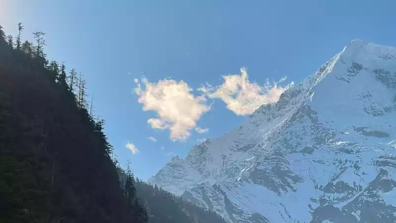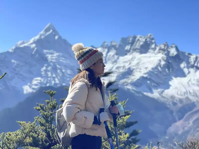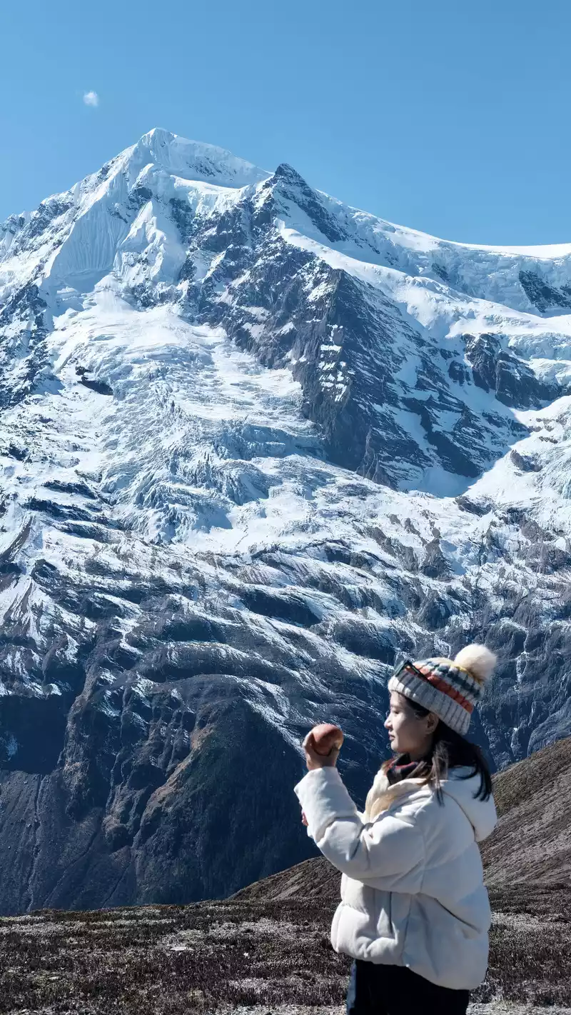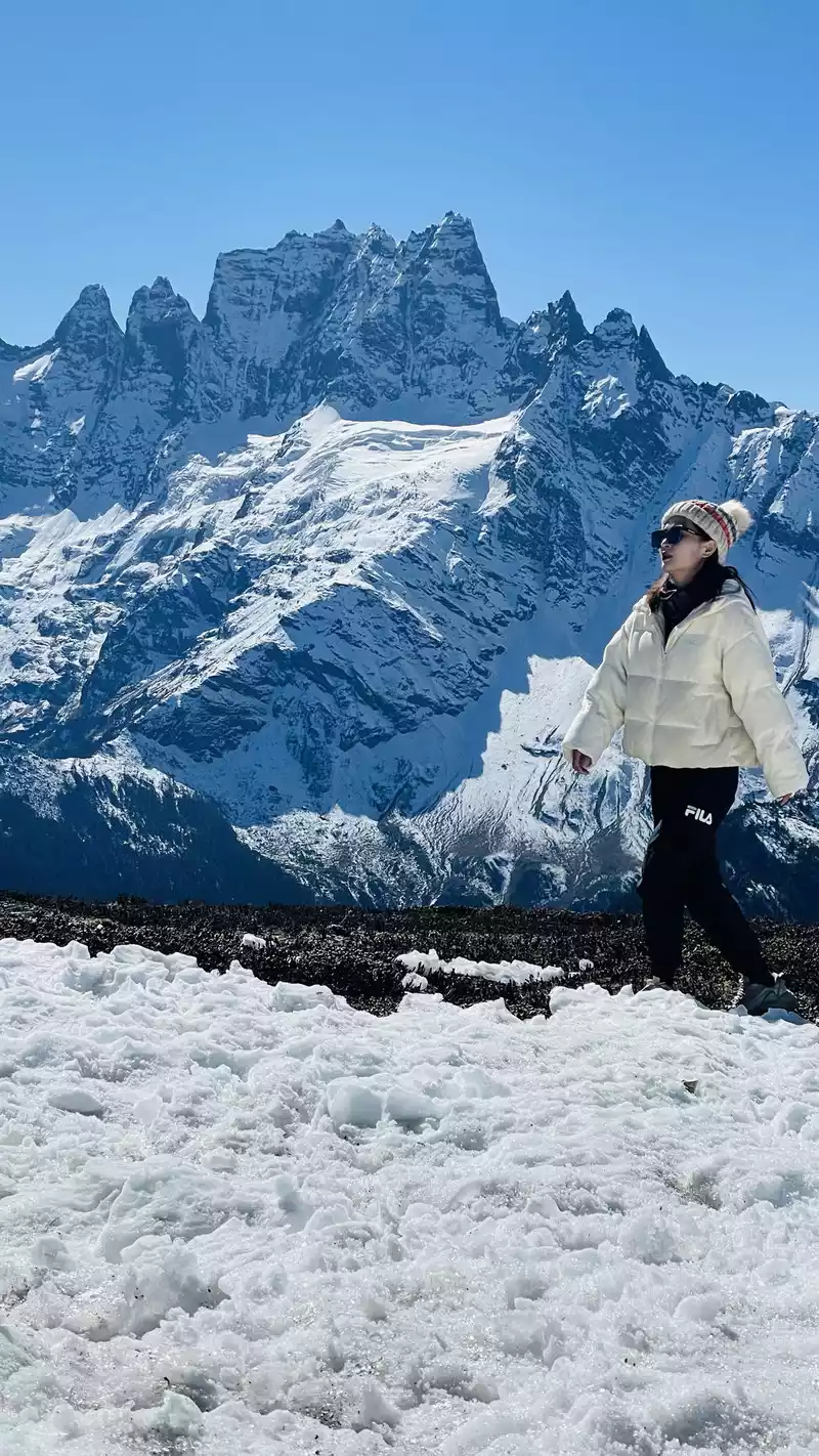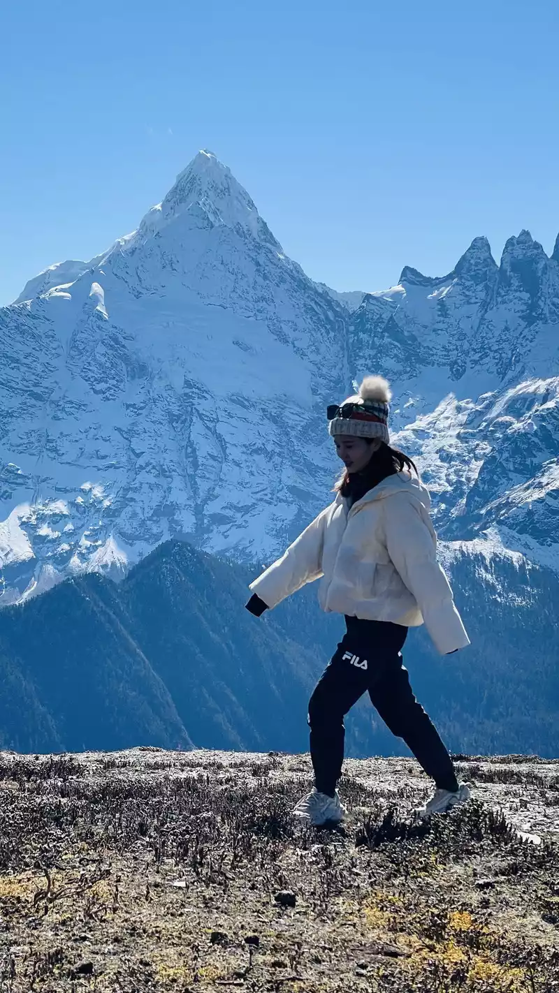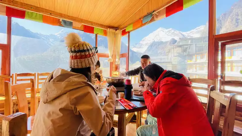 We continued walking alongside Meili Snow Mountain, but we didn't get tired of it at all, and couldn't stop snapping photos with our phones. It took about an hour to drive to Xidang Parking Lot. The original plan was to hike into the village, a distance of about 12 kilometers. The woman in our group didn't want to walk, and we'd seen online posts suggesting that taking a bus to Yubeng would be more convenient. The hiking route offered no scenery and we'd be sharing the road with cars almost the entire way, so we decided to abandon our original plan. Our leader took us all on an off-road vehicle, reluctantly paying the 200 yuan per person fare. A small, dust-covered off-road vehicle had room for seven of us, and it wouldn't move until it was full. The dust flew up like crazy when the doors opened and closed! The bumpy 10-kilometer journey took 30 to 40 minutes. Halfway through, we saw fellow hikers "eating" the dust kicked up by the vehicles. While we felt sorry for them, we also lamented our wise decision, saying it was a good idea to spend some of the "wasted money." After reaching the Shang Yubeng drop-off point, it took another 10 minutes to walk to the village, nestled at the foot of the mountain. Our room faced Shennv Peak, allowing us to converse with it up close. After a brief rest, we checked into our hotel and ordered a chicken hotpot, our first big meal of the trip. Gazing out at the surrounding snow-capped mountains through the large glass windows, I watched steam rise from the hotpot on the table inside. After a few bowls of chicken soup, I was filled with bliss!
