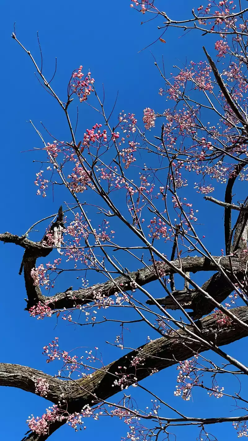 The trail was dotted with ancient trees. Curiously, I asked the tour guide about the route. From a distance, I saw a tree covered in pink flowers, but he couldn't name it. As we got closer, we realized it wasn't a flower, but rather round fruits similar to lotus seeds, in shades of pink and white, very beautiful.