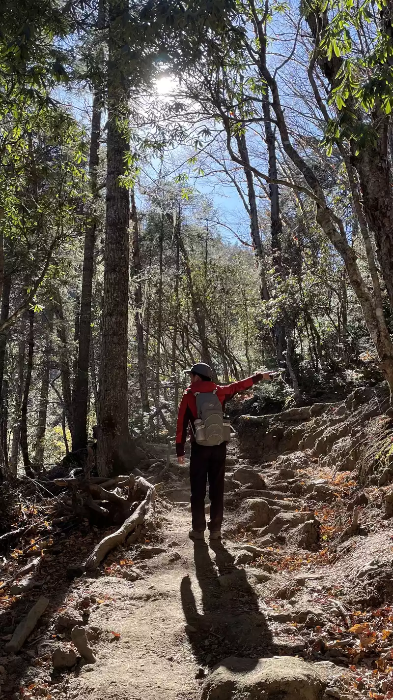 The path up the mountain was not only steep but also rarely used, with the trail mostly covered by leaves, making it prone to landslides. Trekking poles were invaluable. I didn't bring any hiking shoes this time, so I climbed up and down the mountain in my old sneakers the entire time. A true example of ignorance and fearlessness! As we trudged forward two steps, one step back, our leader kept a steady hand from behind, using his trekking pole to keep me from slipping. After about two and a half hours of walking and resting, we finally joined the regular trail (roughly at the mountainside), and it was only then that we saw the first signs of human life. A group of people who had taken the bus to Nanzheng Pass came up. The guide encouraged one of them to keep going, and during the conversation, we learned that two of them had fallen behind due to exhaustion. We soon passed them, and a short stretch of flat road gave me a chance to catch my breath. Nearing the point where the mountainside meets the ridge, the view gradually opened up. Amidst a chorus of "wows," I followed my leader's voice and stopped here to rest and restock. It was the first time I'd ever thought ham sausage could be so delicious! I highly recommend the sucking jelly; it's an absolute must-have on the hike; one sip makes you feel refreshed! After a satisfying meal and a drink, our leader helped me carry my backpack, and we continued towards the ridgeline.