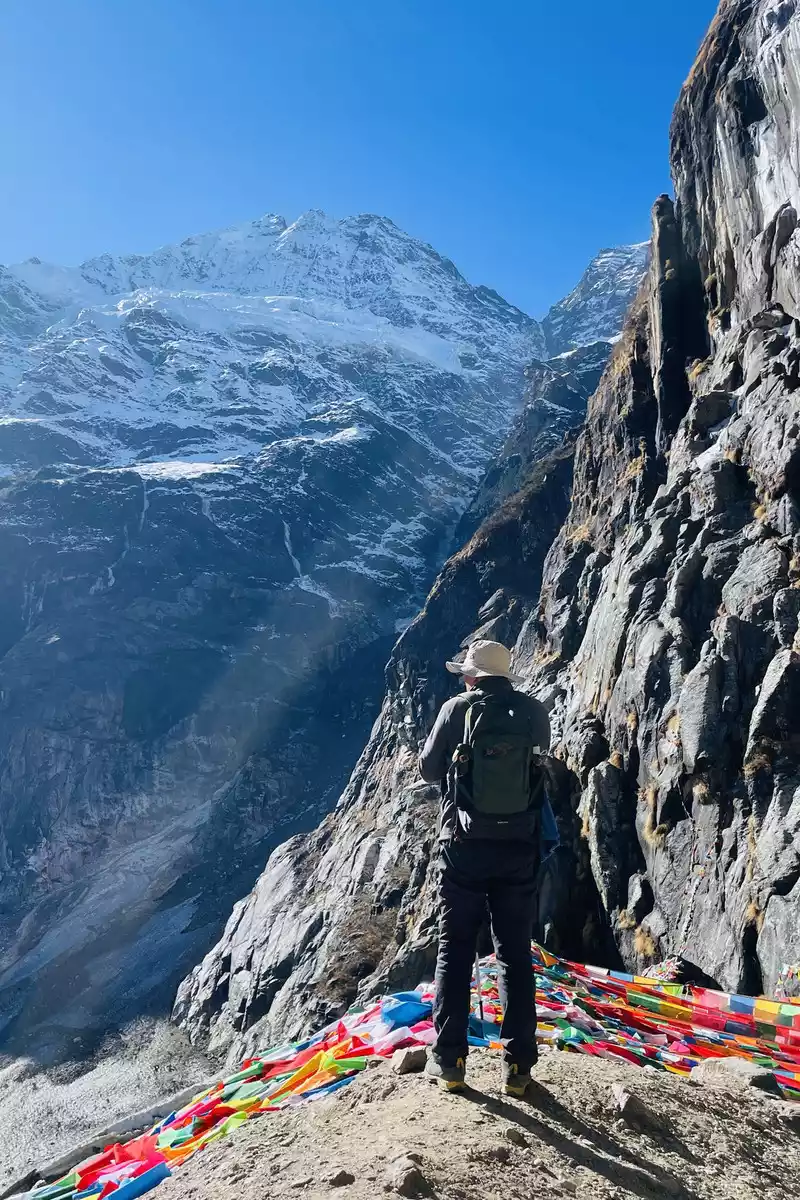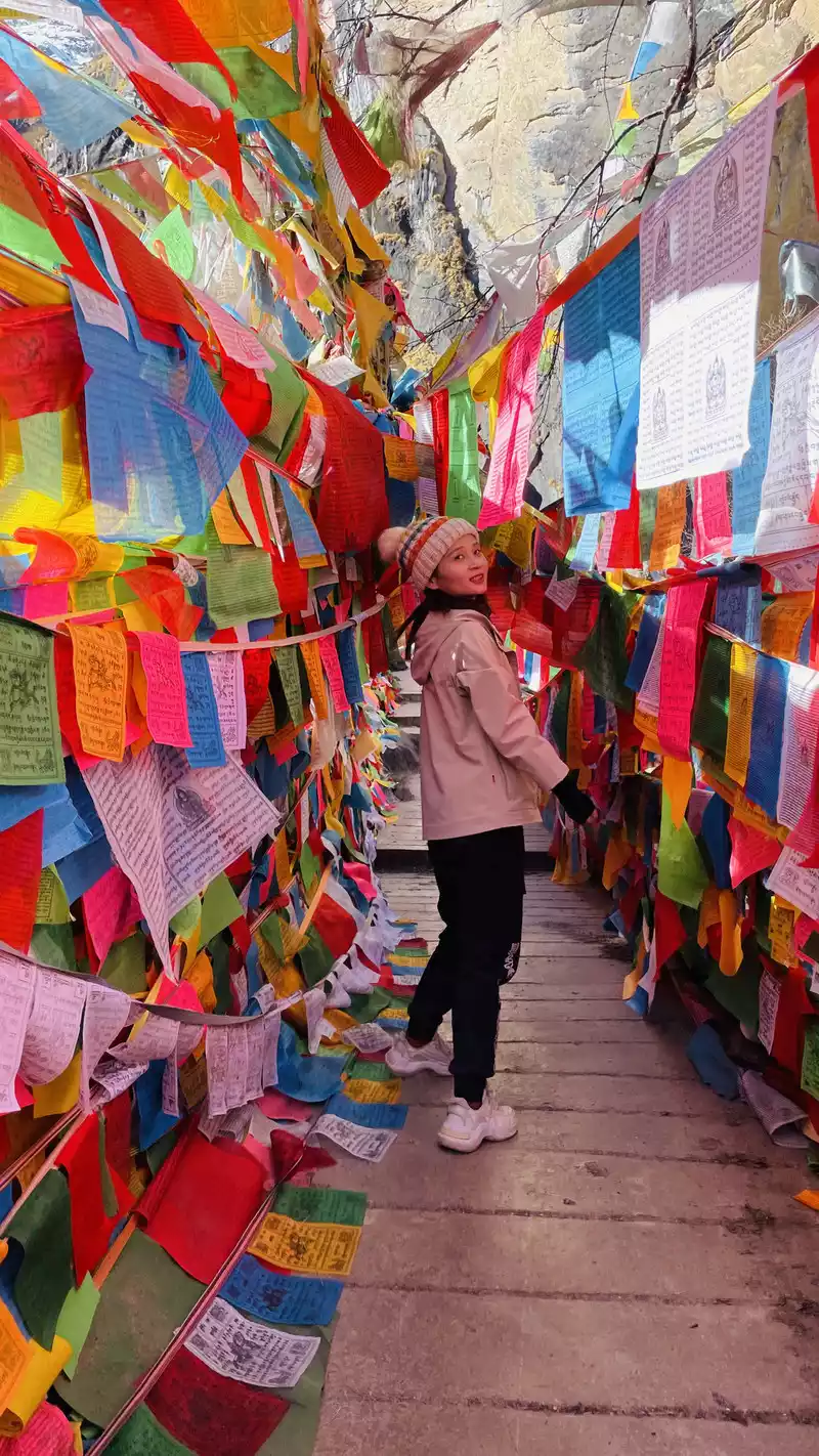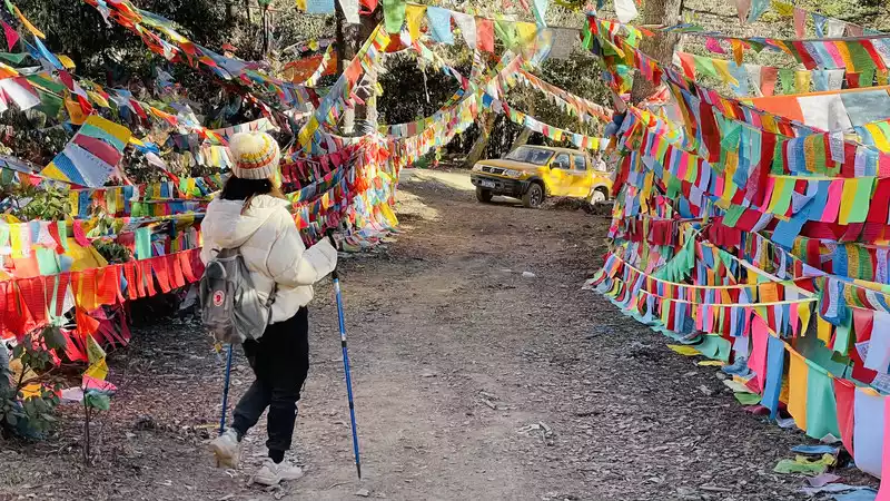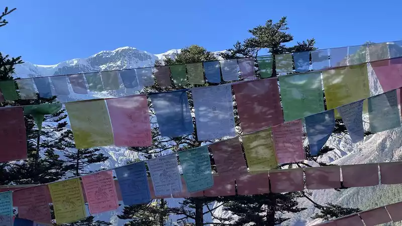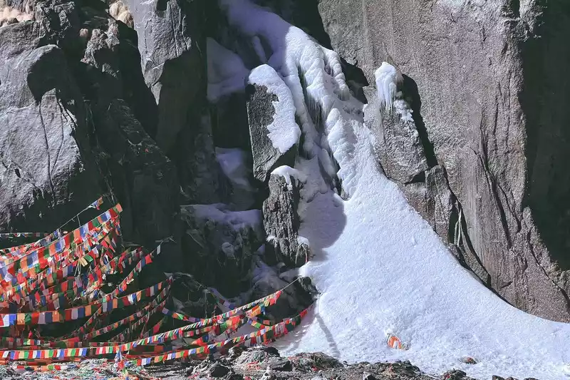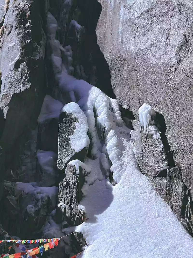 Most of the guests were from the owner's hometown, and hearing the Cantonese-heavy conversation made me think I'd been transported to Guangdong. After a brief chat with the owner, we unpacked and prepared to set off. My sister from Jiangsu, fearing she'd been delayed, decided early on to rent a mule. The leader, along with Brother Wang, my sister from Guangdong, and me, set off first. After yesterday's experience, I'm afraid I've gotten too cocky. Today, I packed light, even skipping my trekking poles. Indeed, I was right. By the end, I discovered that the Shenpu Trail is the most thoroughly renovated of all the Yubeng hiking trails, paved entirely with concrete. For someone like me who easily turns my trekking poles into crutches, concrete is a real pain. I joked, "The ceiling's gone first; today feels like a stroll." While it wasn't as easy as a stroll, it wasn't strenuous at all. The only tiring part was the staircase, about a kilometer or so near the end, which was constantly climbing. The leader kept reminding me to slow down and wait for my companions. I didn't even bother walking properly, insisting on navigating the small dirt paths nearby. He accompanied me up and down. Brother Wang and Sister Guangdong walked obediently along the cement path. After walking a little further, we heard the sound of bells approaching, knowing it was Sister Jiangsu arriving on her mule. They paused briefly to greet us as we continued on our way. Passing a large wall of prayer flags, we reached the end of the hike, just after 11 a.m. A frozen waterfall clung to the rocks, maintaining its flowing shape. Colorful prayer flags fluttered nearby. Looking up, the frozen water at the top of the mountain occasionally broke apart, releasing chunks of ice. Fearing we might be hit, the tour leader repeatedly reminded us not to approach and to simply stand on the slope in front and take photos. The tour leader and Brother Wang surveyed the surroundings, sighing for a moment before stopping for a break and lunch at the nearby White Pagoda. The two sisters happily snapped photos for a while.
