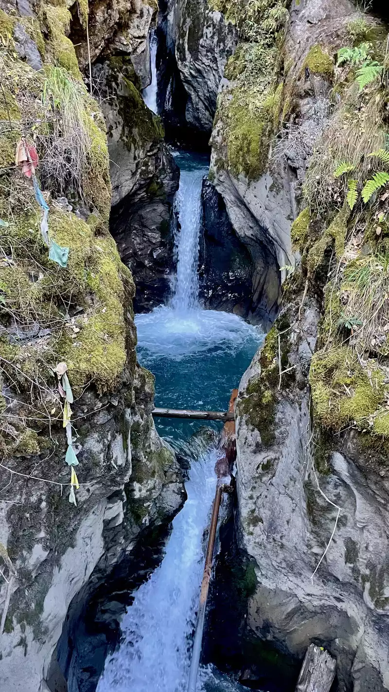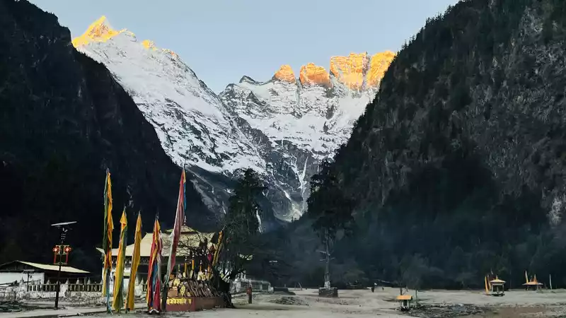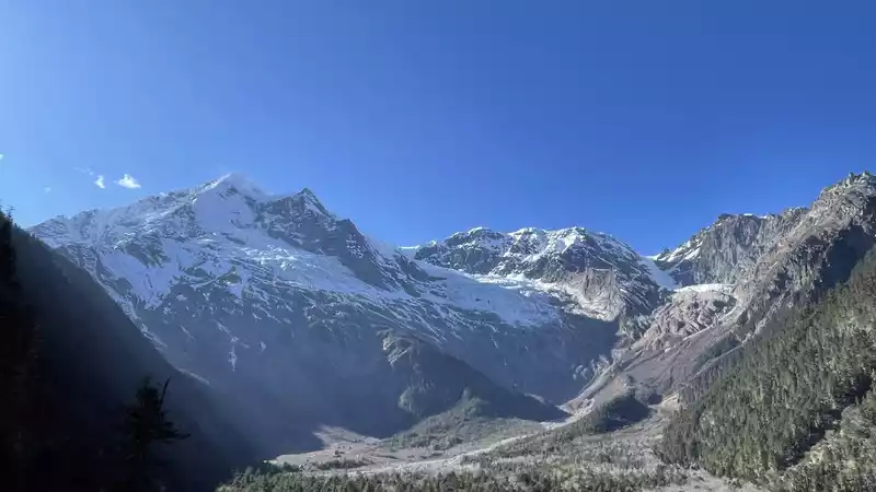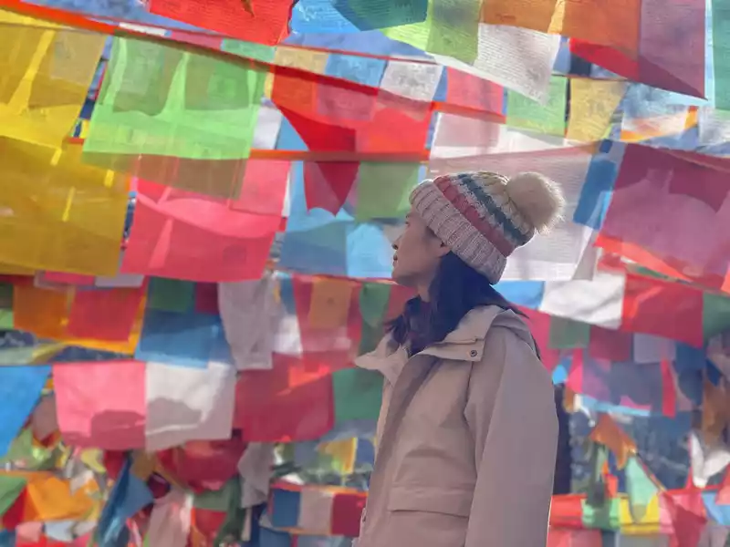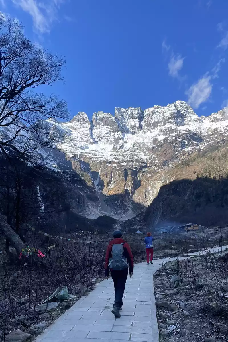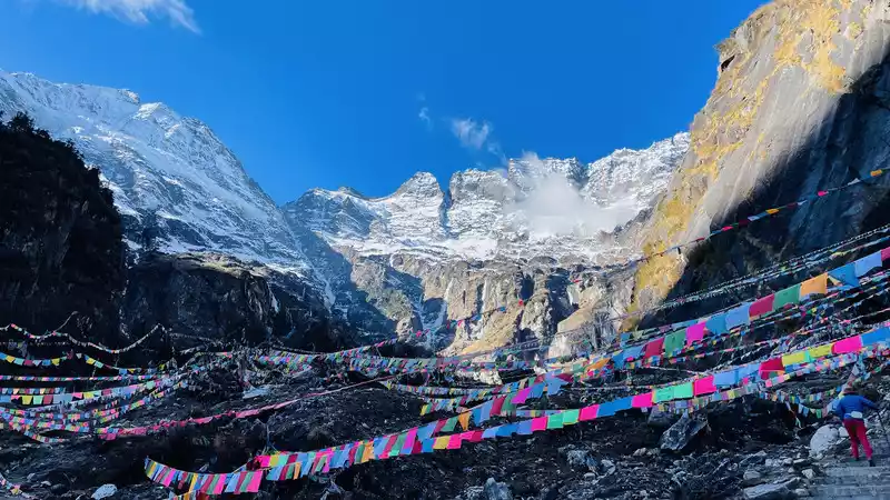 Most of the guests were from the owner's hometown, and hearing the Cantonese-heavy conversation made me think I'd been transported to Guangdong. After a brief chat with the owner, we unpacked and prepared to set off. My sister from Jiangsu, fearing she'd been delayed, decided early on to rent a mule. The leader, along with Brother Wang, my sister from Guangdong, and me, set off first. After yesterday's experience, I'm afraid I've gotten too cocky. Today, I packed light, even skipping my trekking poles. Indeed, I was right. By the end, I discovered that the Shenpu Trail is the most thoroughly renovated of all the Yubeng hiking trails, paved entirely with concrete. For someone like me who easily turns my trekking poles into crutches, concrete is a real pain. I joked, "The ceiling's gone first; today feels like a stroll." While it wasn't as easy as a stroll, it wasn't strenuous at all. The only tiring part was the staircase, about a kilometer or so near the end, which was constantly climbing. The leader kept reminding me to slow down and wait for my companions. I didn't even bother walking properly, insisting on navigating the small dirt paths nearby. He accompanied me up and down. Brother Wang and Sister Guangdong walked obediently along the cement path. After walking a little further, we heard the sound of bells approaching, knowing it was Sister Jiangsu arriving on her mule. They paused briefly to greet us as we continued on our way. Passing a large wall of prayer flags, we reached the end of the hike, just after 11 a.m. A frozen waterfall clung to the rocks, maintaining its flowing shape. Colorful prayer flags fluttered nearby. Looking up, the frozen water at the top of the mountain occasionally broke apart, releasing chunks of ice. Fearing we might be hit, the tour leader repeatedly reminded us not to approach and to simply stand on the slope in front and take photos. The tour leader and Brother Wang surveyed the surroundings, sighing for a moment before stopping for a break and lunch at the nearby White Pagoda. The two sisters happily snapped photos for a while.