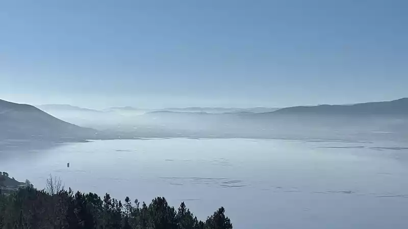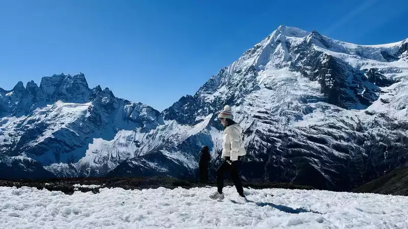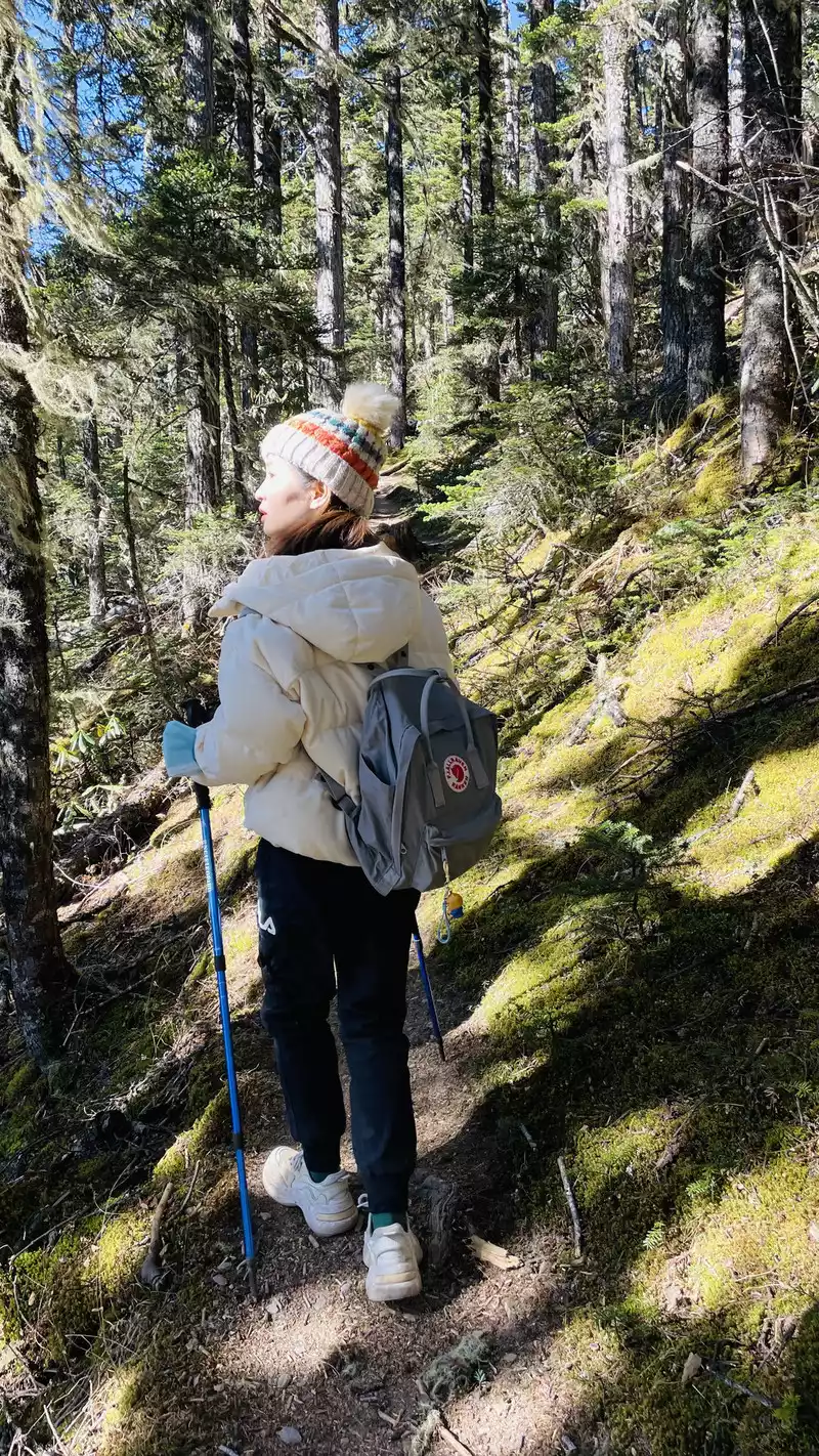 Perhaps my team leader and I were walking too fast, and the two sisters fell behind. My companion, Brother Wang, was still following closely behind, and the distance between us gradually widened as we climbed in altitude. We walked nearly 3 kilometers to the first rest shelter. Halfway through, we encountered some slippery, icy sections. We stopped and asked our friends in the group chat how they were doing. My sister, Guangdong, said they couldn't go any further and were turning back, so I reminded her to take photos and share them. Half an hour later, Wang replied, saying they had just taken a fork and were heading back. My leader and I continued our ascent. We passed people returning from the glacial lake and asked why we'd just gone up. They reminded us it was getting late and that it would be unsafe to return. We explained that we were just strolling around and had no intention of reaching the end. We soon reached Xiaonong Pass, where there's an observation deck with a direct view of Jiangjun Peak. We planned to stop there. The people returning also said there was no need to go any further, as the path was bad and the glacial lake was only the size of a pond. At this point, we'd walked for 1.5 hours, 4 kilometers, and gained 450 meters in elevation. That's a pretty good pace.