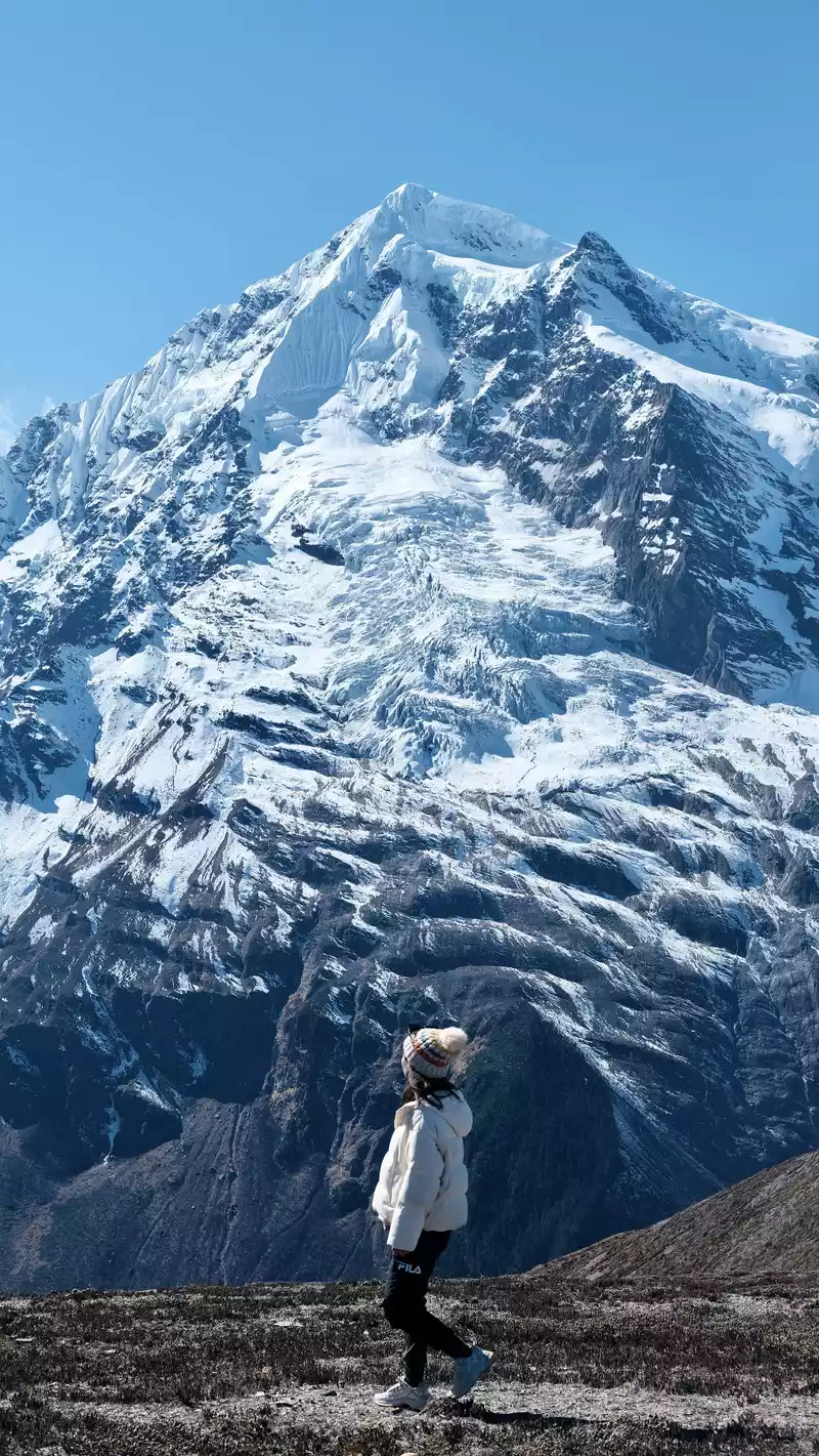 We finally arrived a little after 2:00 PM. The summit platform wasn't crowded at the moment, and here, snow-capped mountains surrounded me on all sides. I can't find words to describe my awe and deepest emotion. It's an experience you can't truly experience from words or pictures unless you're there in person! Truly, the most breathtaking scenery is on the perilous peaks! After jumping around and taking photos for a while, I finally felt cold. I continued to refuel and devoured most of the food I brought up... I heard a familiar voice in the distance. Looking over, it was indeed the girl I met at Feilai Temple. After I greeted her, she enthusiastically started taking photos of me. Then, they began their descent.