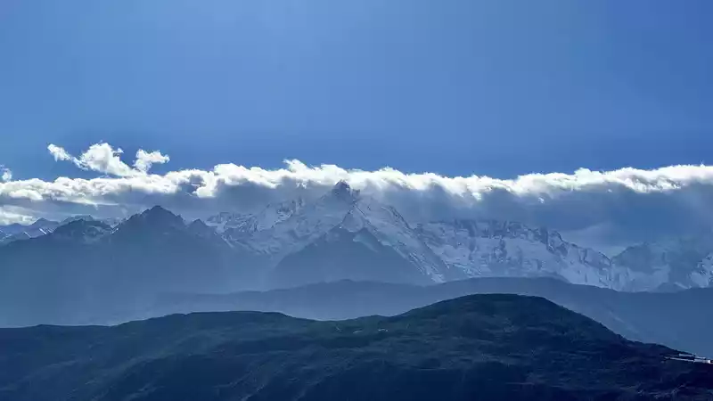 Snow-capped mountains began to come into view along the way, starting with the vast expanse of Baima Mountain. As dusk approached, the Meili Snow Mountain joined the view. Sitting in the passenger seat, I enjoyed the unobstructed view while also shouldering the "heavy burden" of capturing the beautiful scenery for everyone in the car. I wished I had eight eyes and four hands.