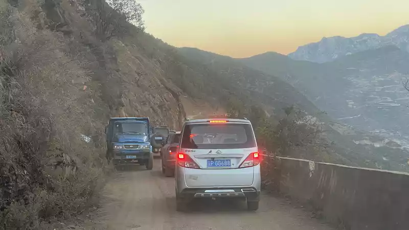 At 5:58, the car in the front row started! I finally made it through, but the rest was not easy. About 30 kilometers were covered in mud. Trucks were coming from opposite directions on the not-so-wide road from time to time. In some areas, it was even impossible to miss the train. The whole process made the team leader lose his temper! It was hard work for him as a part-time driver this time. The road was even harder to navigate in the dark. Fortunately, he was good at driving. He hurriedly arrived at the parking lot at 7:40. It was said that the parking lot was actually an open space at the entrance of the village.
