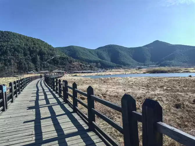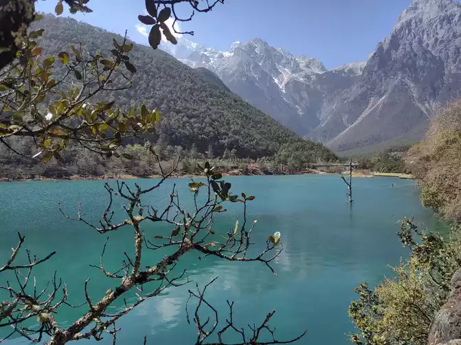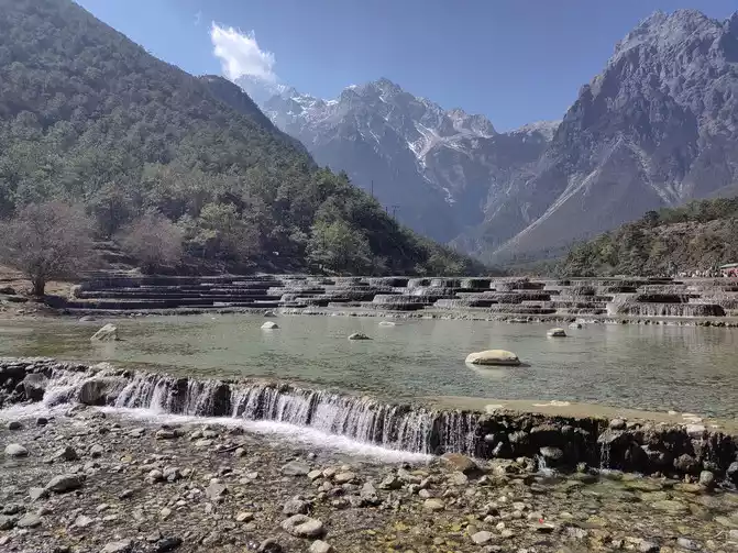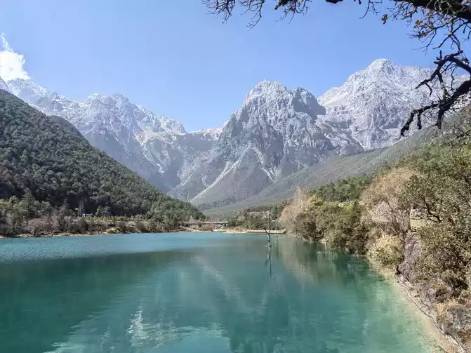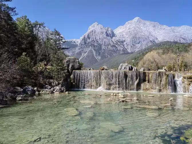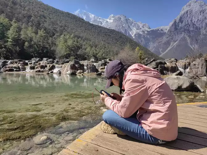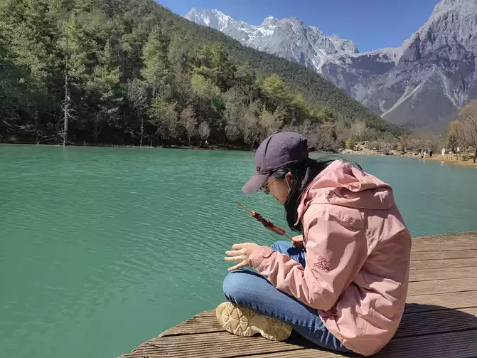 After breakfast at a rice noodle shop near Mufu Palace, I arrived at the bus stop near Zhongyi Market around 9:30 AM and took Bus 101 to Jade Dragon Snow Mountain. The 101 runs every 20 minutes or half an hour, and the ride takes about an hour. You can check the departure times and walk to the bus stop accordingly. Try to sit on the left side of the bus for better views. The Yulong Snow Mountain Scenic Area includes Yulong Snow Mountain, Blue Moon Valley, Yunshanping, Yaoniuping and other attractions. You need to take the scenic area tour bus to reach each attraction. We don’t like climbing snow mountains, and the grasslands in this season are probably not beautiful, so we only chose the Blue Moon Valley. The Blue Moon Valley alone is beautiful enough to make this trip worthwhile. On the shuttle bus, you'll be told to buy your entrance ticket. Then, at the visitor center, you can purchase your tickets for the scenic area shuttle bus based on your destination. The visitor center itself is quite chaotic, so be sure to greet the bus after getting off and make sure you're in the right spot to board. The bus will stop at Parking Lot 3 on the way back, and you can take the 101 shuttle bus directly back to the city. The shuttle bus to Blue Moon Valley has two stops: the first seems to be where the electric bus starts, and the second is Shuiyue Pavilion. I personally think getting off at the first stop is preferable, as it's at the very top of Blue Moon Valley, with Shuiyun Pavilion roughly halfway down. There's also a scenic plank road below Shuiyue Pavilion. Getting off at the first stop allows you to explore the valley from top to bottom, passing Shuiyue Pavilion before walking down again and then returning to Shuiyue Pavilion to catch the bus back to the Visitor Center, thus only walking halfway back. We followed online information and got off at the second stop, Shuiyue Pavilion. We walked down, then back to Shuiyue Pavilion, and then up to the electric bus starting point. Since we couldn't find the exit to catch the tour bus, we returned to Shuiyue Pavilion to catch the bus, completing each section twice. We walked and stopped throughout the entire circuit, enjoying the area so much that we didn't feel tired at all. We could have easily skipped the electric bus.