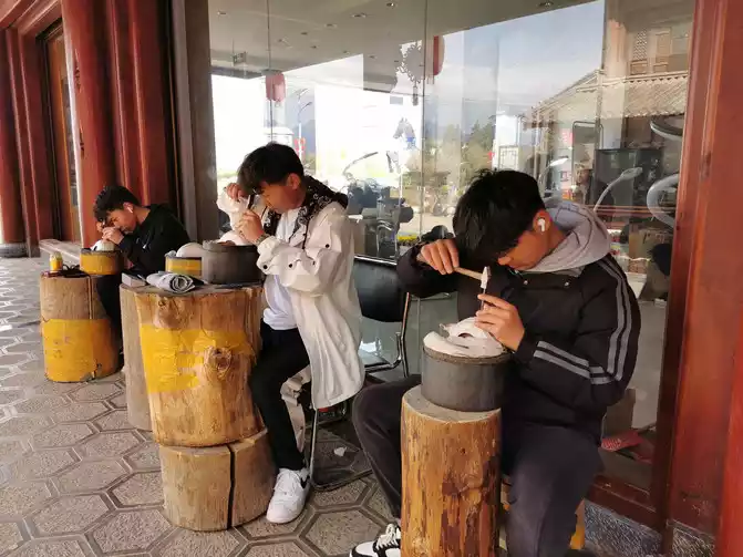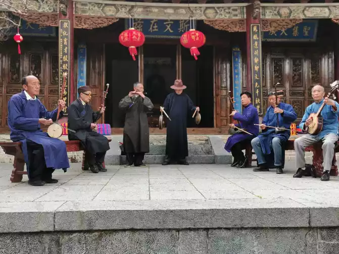 In Fengyu Ancient Town, several old men in long gowns play Nanzhao ancient music.