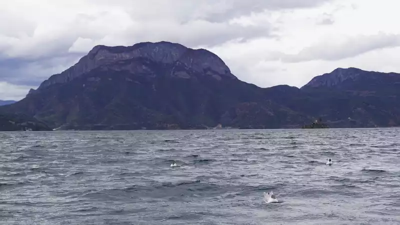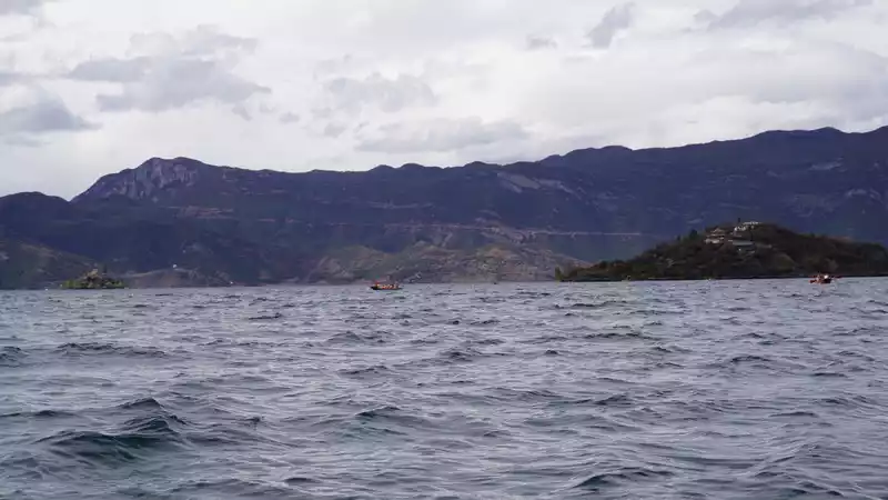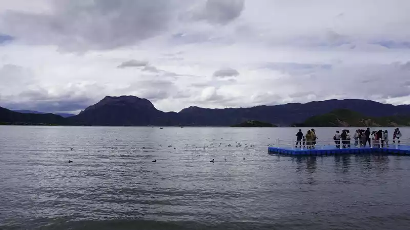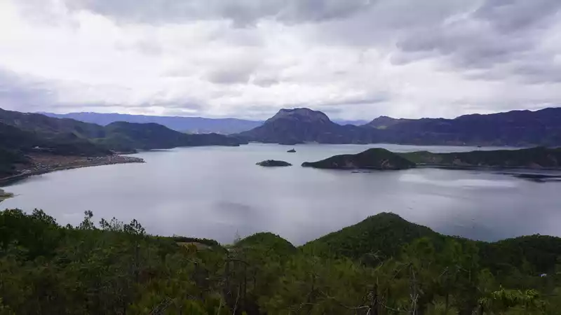 two sections of highway and one section of road from Lijiang, winding around the mountains, It took about 2 and a half hours to drive to Lugu Lake. Near the entrance is an observation deck with a panoramic view.