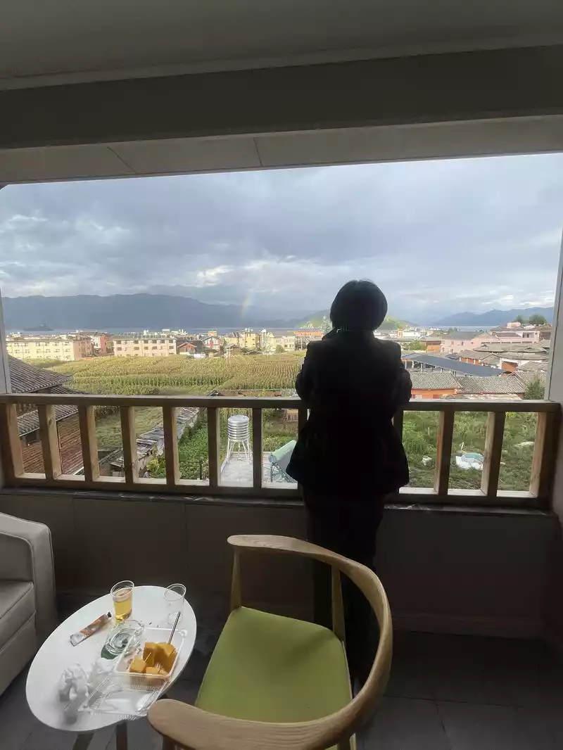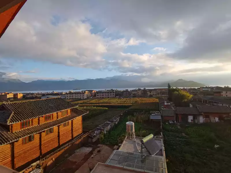 In the early morning, the hotel balcony overlooks Lugu Lake.