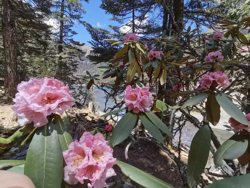 As expected, the scenery here is beautiful. The lake is rippling with emerald green waves, and the water is exceptionally clear. And from here, you can even see the snow-capped mountains. The snow-capped mountains in the distance looked divine, and the lush greenery nearby was also beautiful. The trees here looked completely different from those inland. They were covered in beautiful woody flowers. The ground here was covered in moss due to the constant humidity. This moss gave the area a primeval forest feel. While we were enjoying the natural scenery while walking, we were also concerned about the presence of snakes. After all, Yunnan itself has its share of snakes.