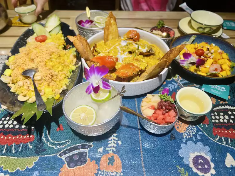 There are several branches within the Gaozhuang West Scenic Area. We visited one and walked into a tropical courtyard, decorated with tropical plants and a fresh, natural decor. The lime lychee and breaded curry crab are must-trys. The lime lychee is so refreshing that you can't stop eating. The curry crab is a must-order for every table. It comes with two crabs, one male and one female, and the ingredients are quite fresh. The pineapple rice and green beans are average. This restaurant is ranked number one in local Thai food reviews and is considered an internet-famous restaurant. For an internet-famous restaurant, the food is quite good.