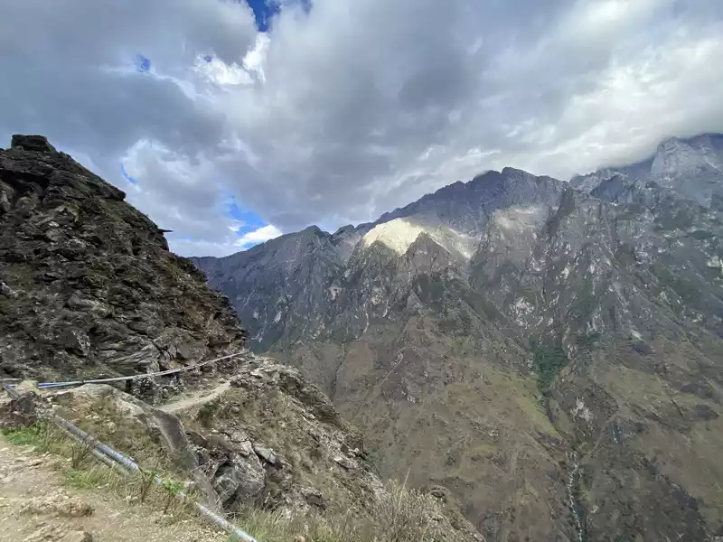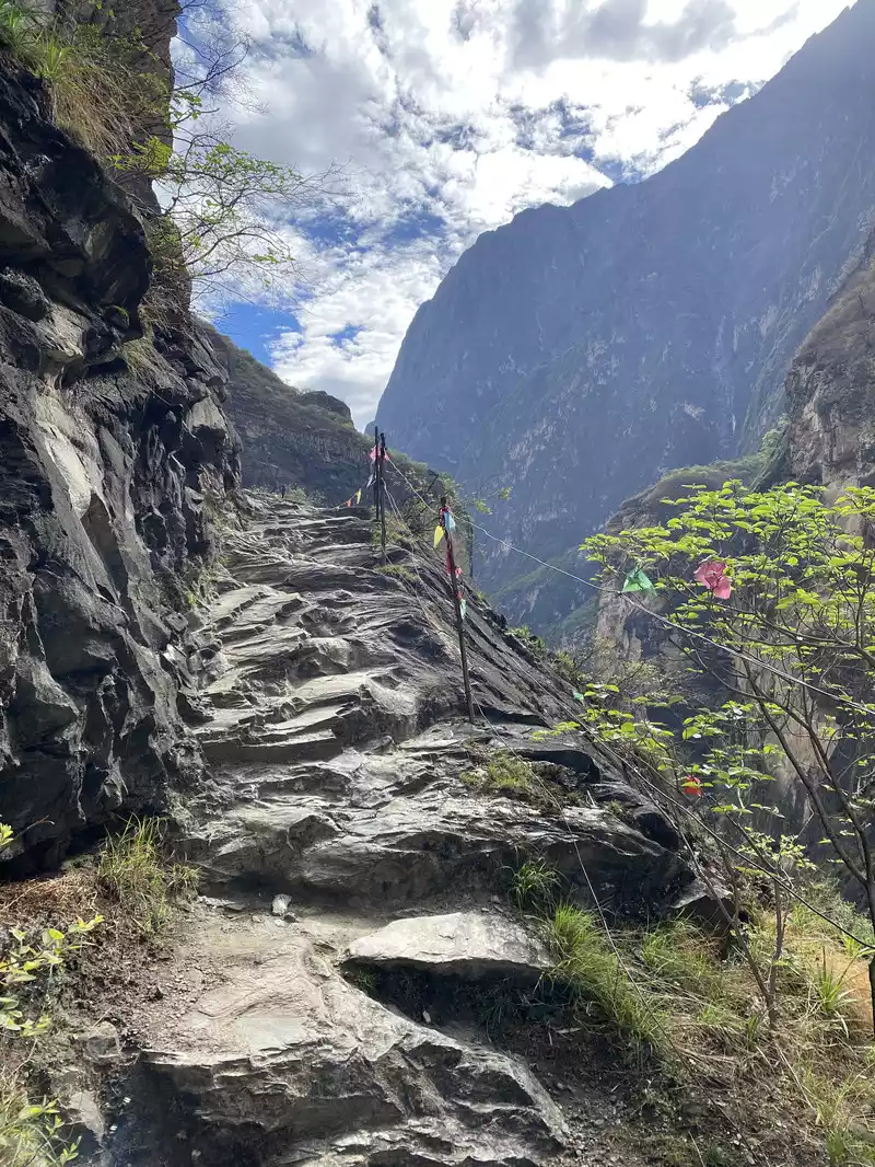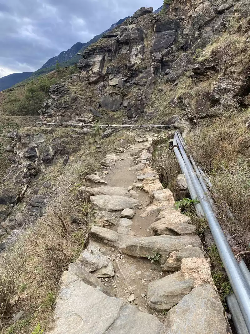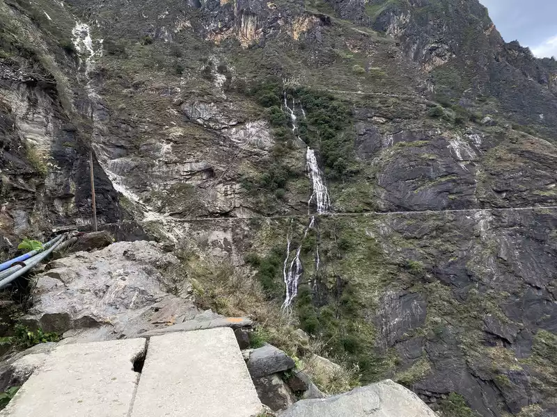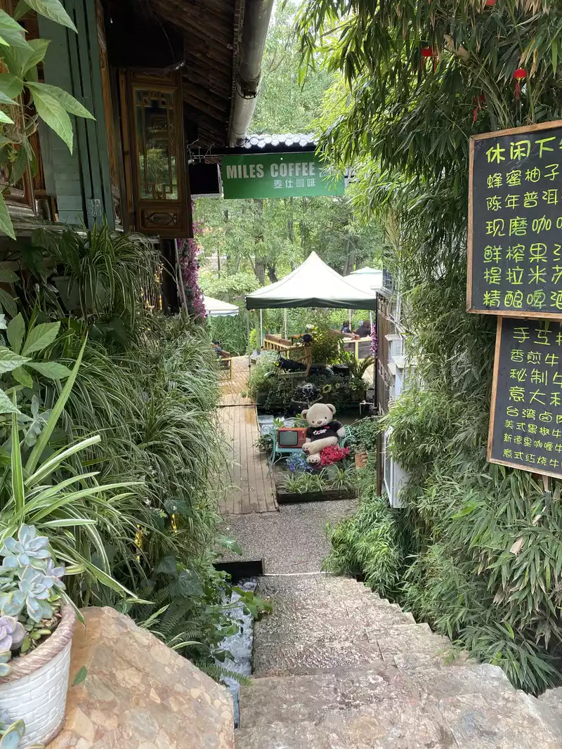 We originally booked Banshanju because the standard rooms on the Halfway route were sold out. 😂 Banshanju Inn is a 2-3 minute walk to Halfway. Once we got there, we noticed so many people had suddenly appeared. It was so lively running up and down, and there was even a tour guide leading the group in stretching. The view from the large terrace at the back of Jade Dragon Snow Mountain was amazing. It felt so close that you could almost touch it. The terrace is really nice. If the sun isn't shining, you can sit there for half a day. After enjoying a good coffee and taking enough photos, we decided to walk back to Tin's Inn to see the waterfall. We walked along the cement road for 15 minutes, then turned a corner and found that there was no waterfall in sight. We decided to turn back. My friend looked for the waterfall on his phone, and Amap showed it was a 7-minute walk. So, we continued on together. This section of the trail was a bit more difficult than the previous one.