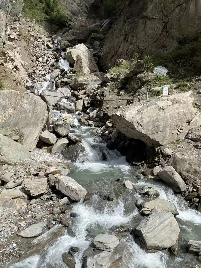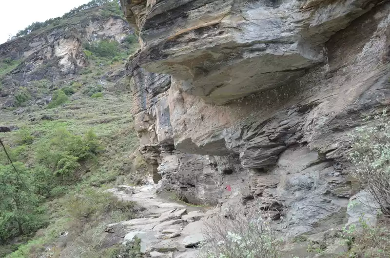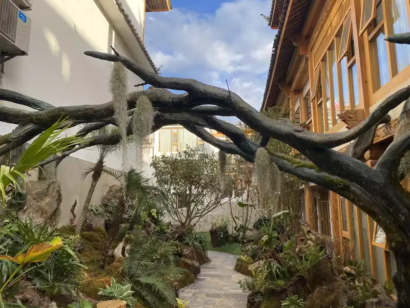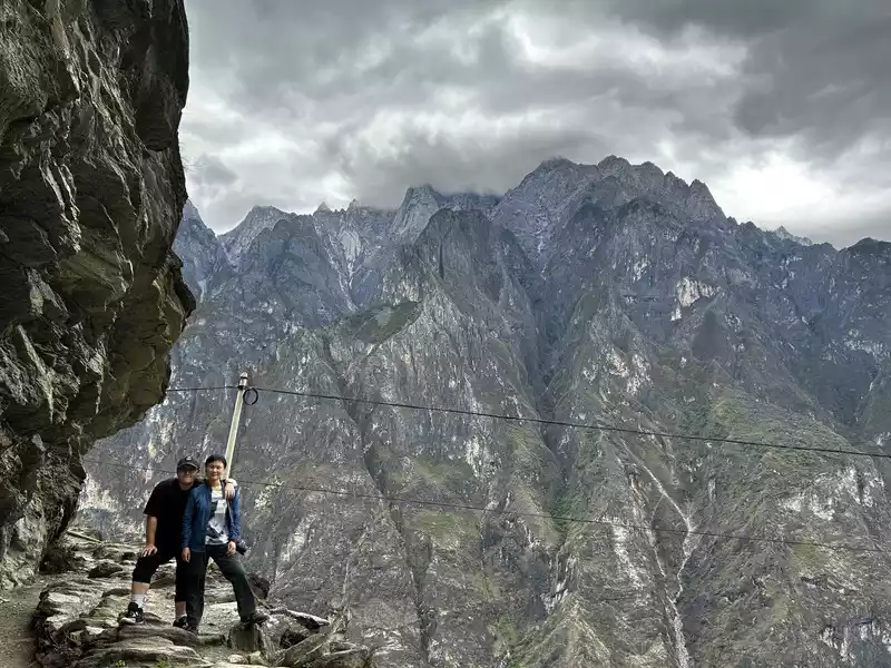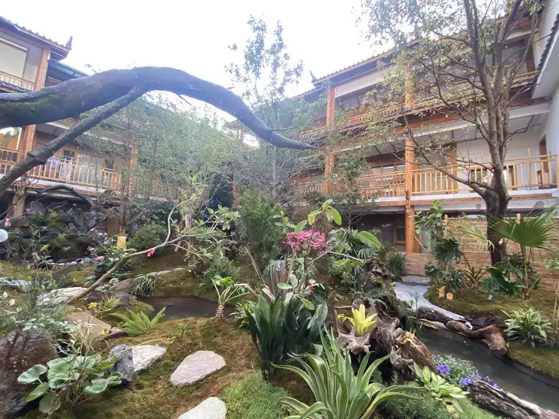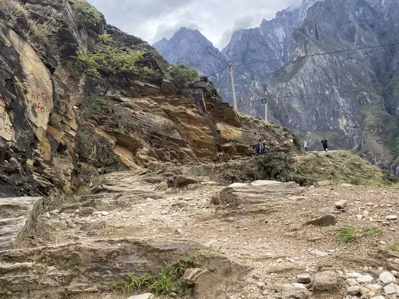 We originally booked Banshanju because the standard rooms on the Halfway route were sold out. 😂 Banshanju Inn is a 2-3 minute walk to Halfway. Once we got there, we noticed so many people had suddenly appeared. It was so lively running up and down, and there was even a tour guide leading the group in stretching. The view from the large terrace at the back of Jade Dragon Snow Mountain was amazing. It felt so close that you could almost touch it. The terrace is really nice. If the sun isn't shining, you can sit there for half a day. After enjoying a good coffee and taking enough photos, we decided to walk back to Tin's Inn to see the waterfall. We walked along the cement road for 15 minutes, then turned a corner and found that there was no waterfall in sight. We decided to turn back. My friend looked for the waterfall on his phone, and Amap showed it was a 7-minute walk. So, we continued on together. This section of the trail was a bit more difficult than the previous one.