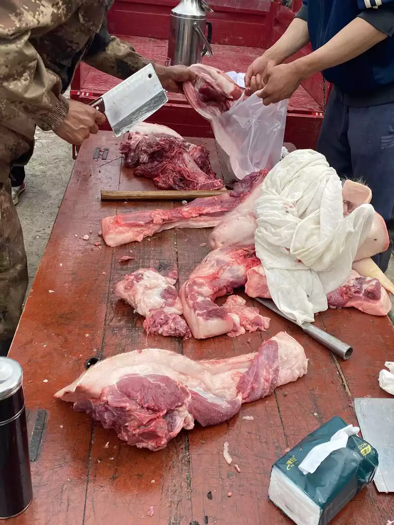There are pork stalls on the pedestrian street. The white fat meat, the pig must have never tasted the taste of clenbuterol.