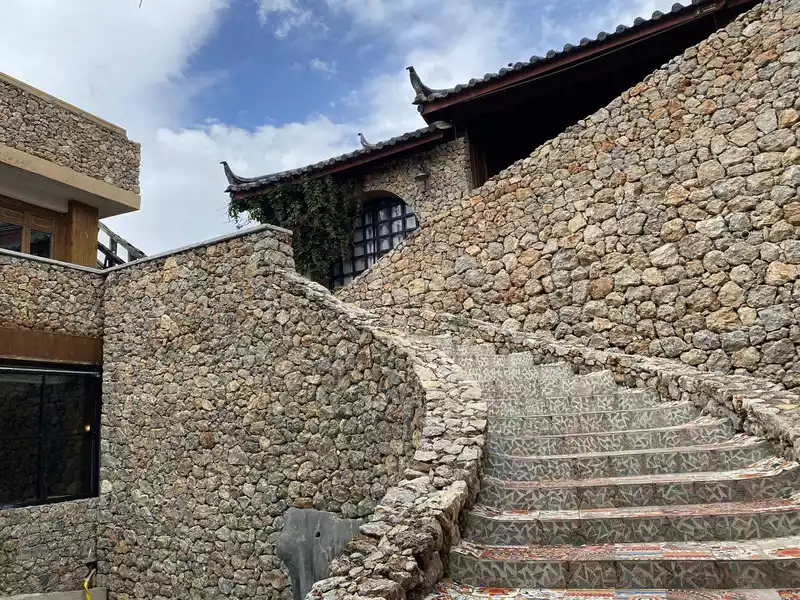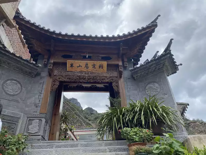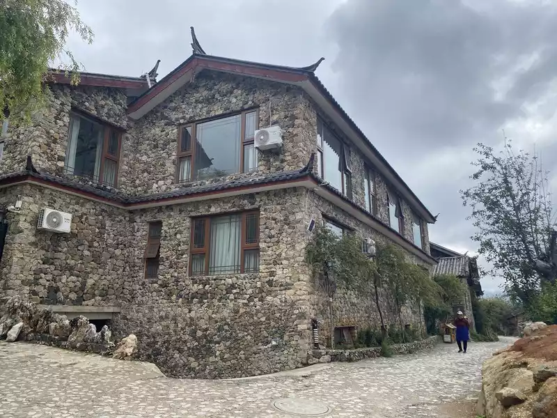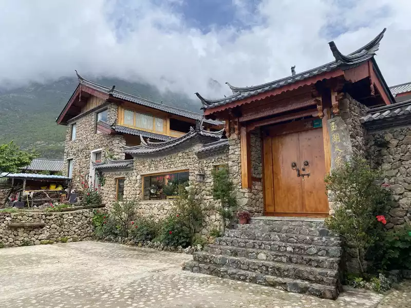The East Loop soon led to the fork in the road leading to the Tea Horse Inn. The road was narrow and winding, making it challenging for beginners. We parked in the courtyard of the Tea Horse Inn and had a simple lunch there. We left the owner's phone number. When we were almost at the Banshanju Inn, we called him and he would come pick us up, saving us the trouble of paying for two separate parking fees.