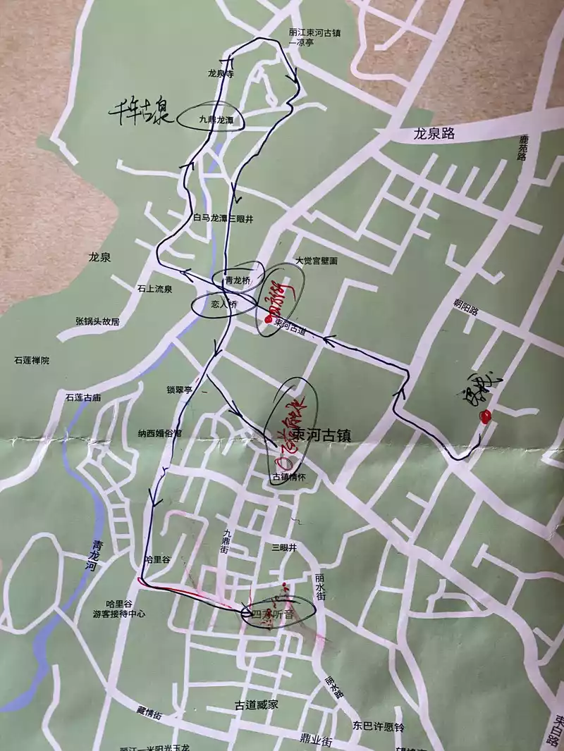 It was already past 1 pm when we returned to Shuhe. After checking out, we casually walked around Shuhe Ancient Town. The route map drawn by the inn boy.