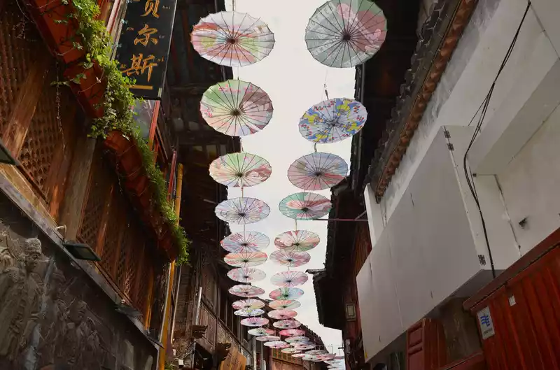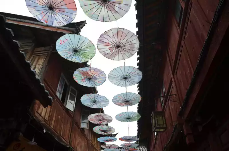 Entering from an intersection of Sifang Street is the Oil-Paper Umbrella Street. The colors of the oil-paper umbrellas during the day are lighter and not as stunning as at night.