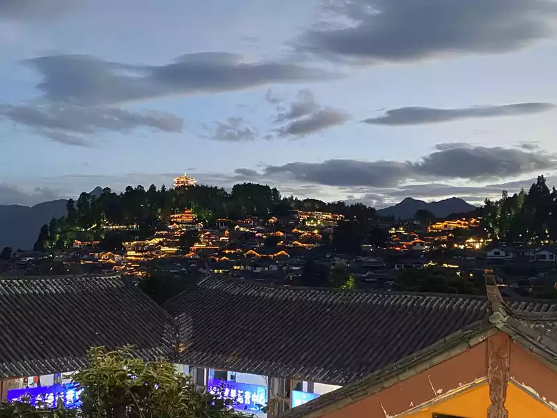 We left the hotel at 8 o'clock and followed the navigation to the Eye of Lijiang. From the Eye of Lijiang, you can see the Lion Rock opposite and the Wenchang Palace which we had just visited in the afternoon. As night fell, the lights were already bright.